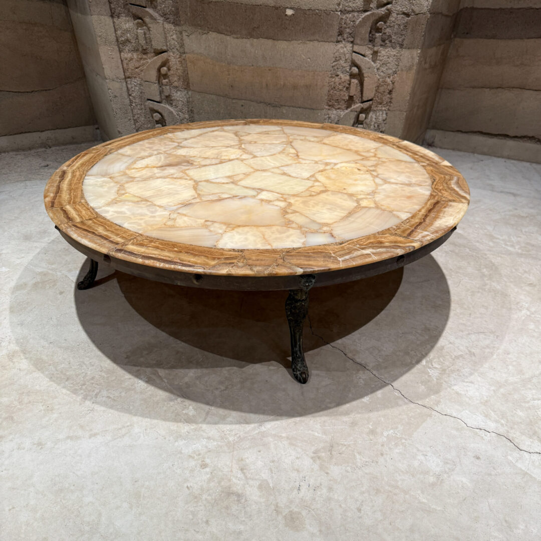 For your consideration, a Muller of Mexico glamorous modern round onyx stone coffee table with sculptural cabriole legs. Brown and tan tones. Made in Mexico circa the 1960s.