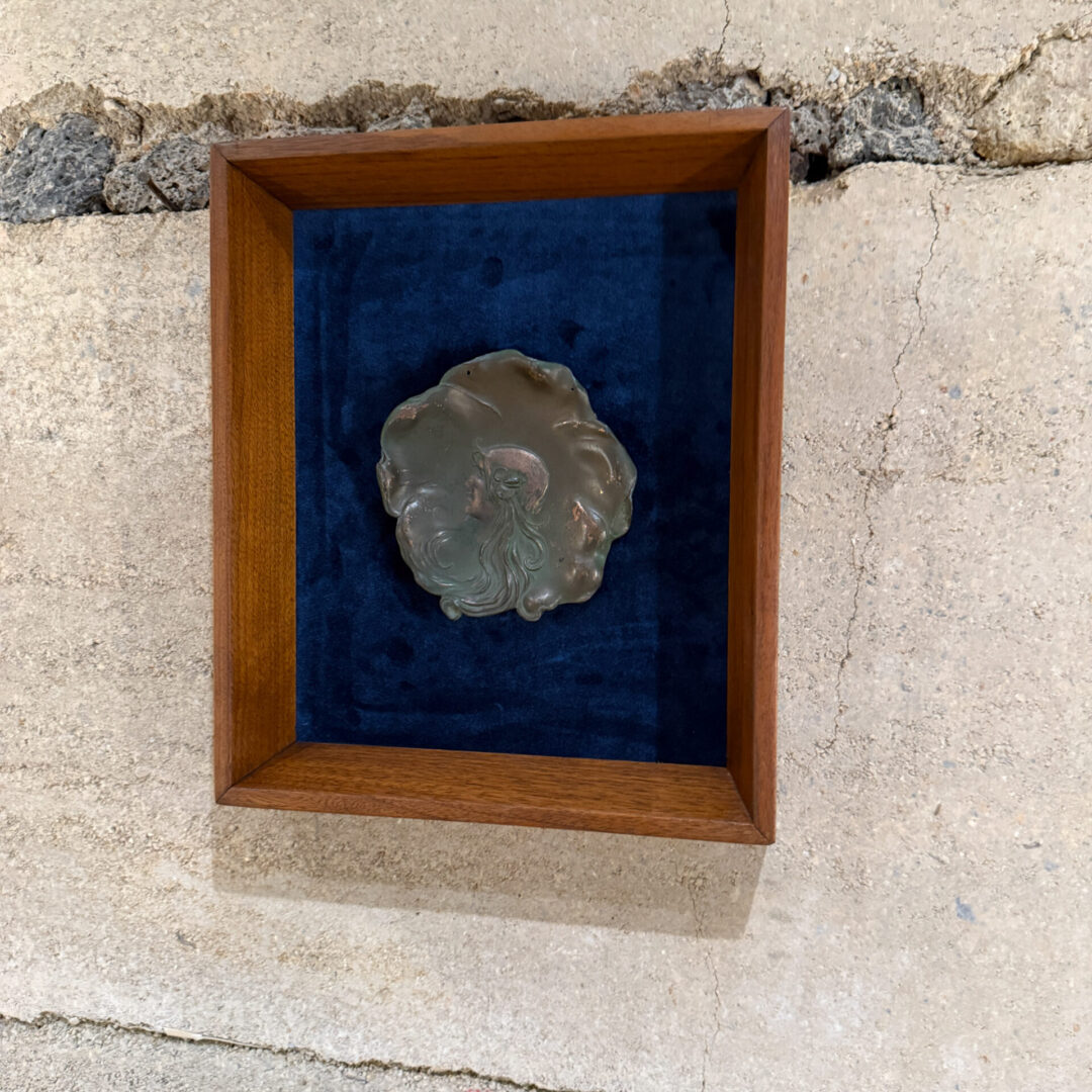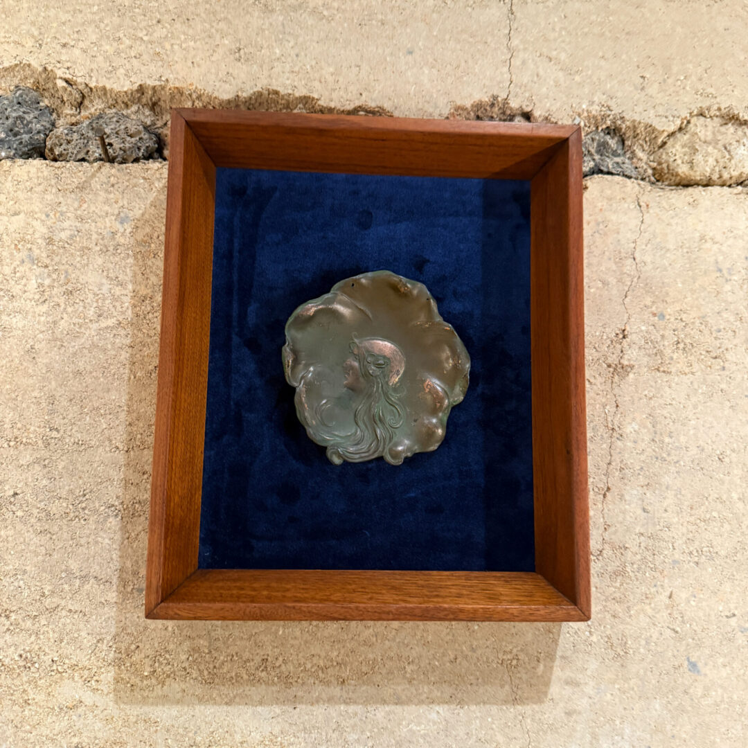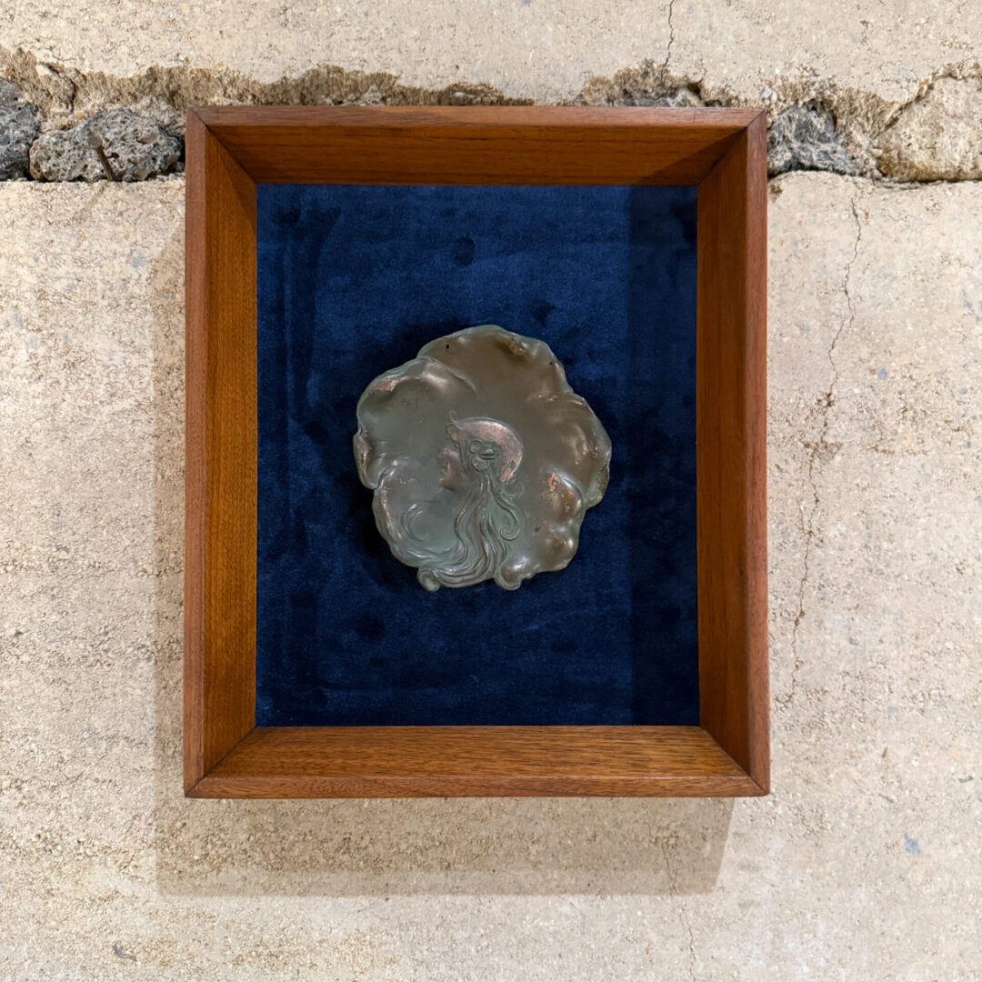 For your consideration, an Art Nouveau deco fair maiden sculptural leaf dish . Signed and Dated April 4, 1906. Framed in Walnut wood with blue velvet background.