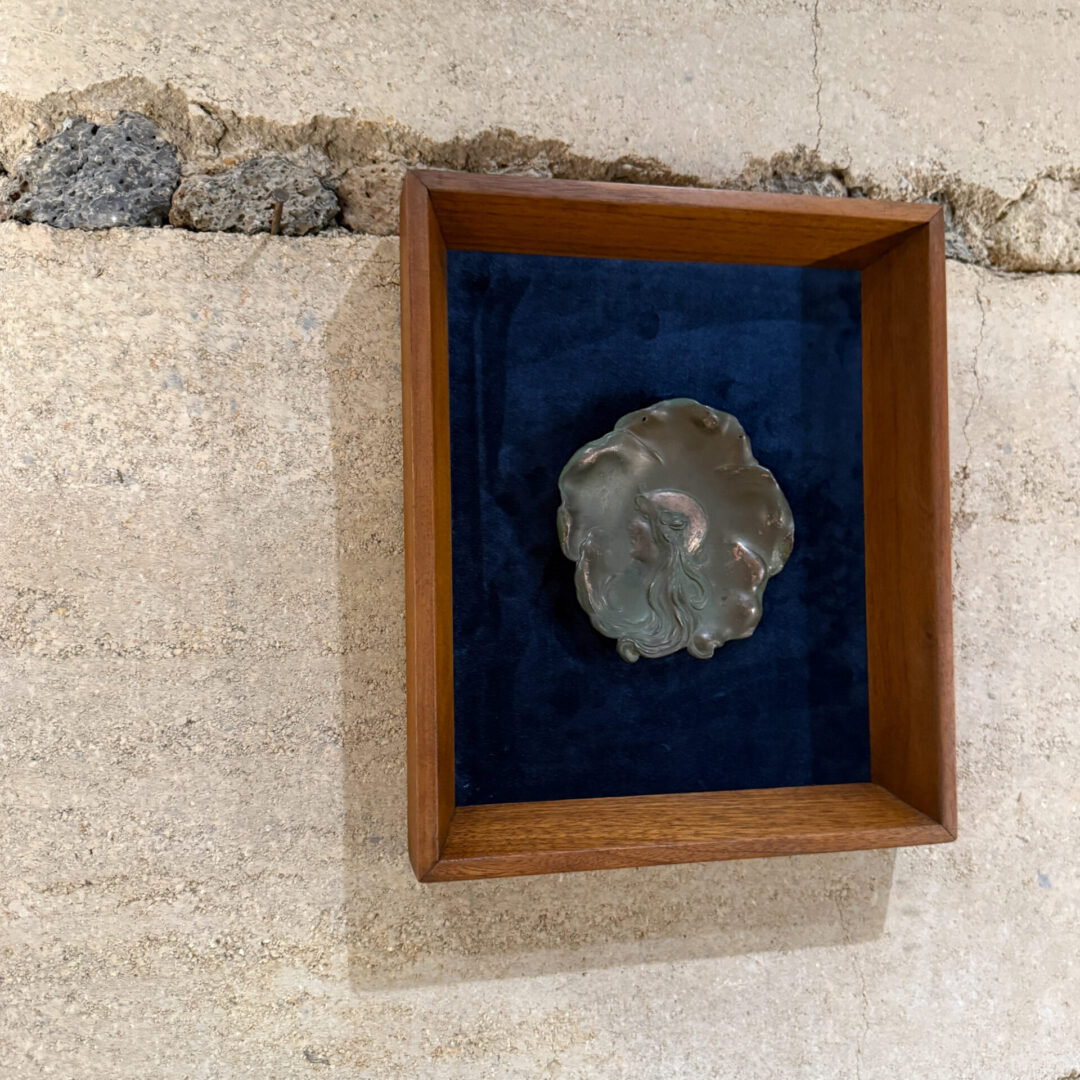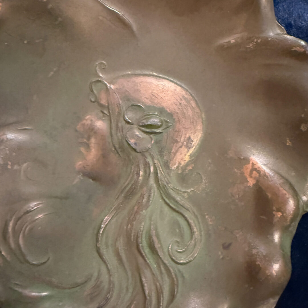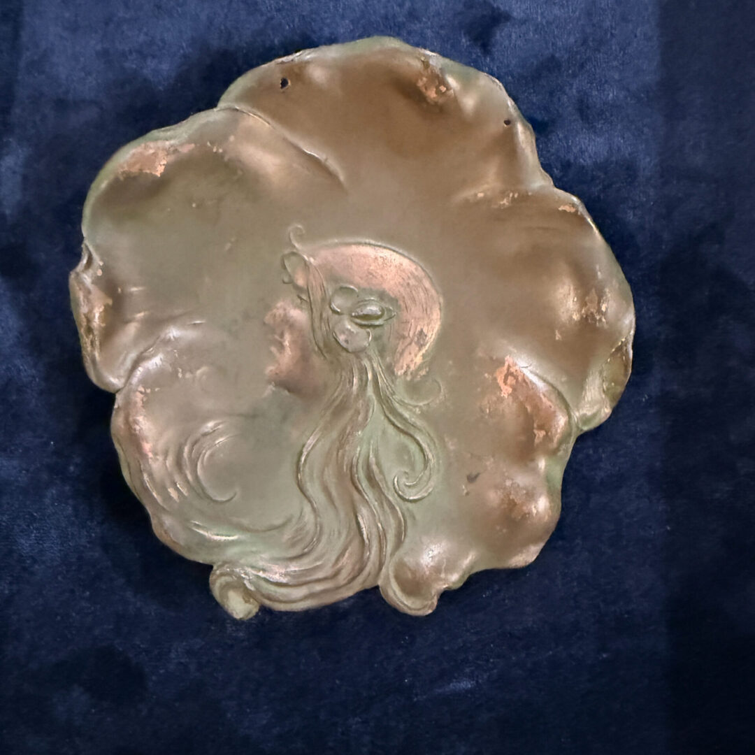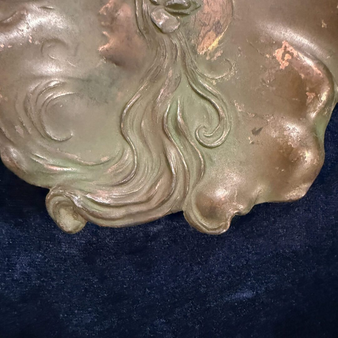 For your consideration, an Art Nouveau deco fair maiden sculptural leaf dish . Signed and Dated April 4, 1906. Framed in Walnut wood with blue velvet background.