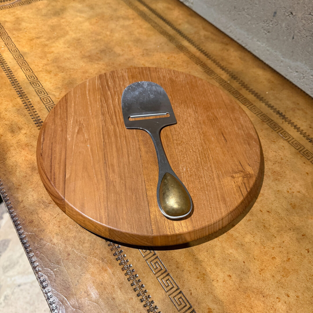 For your consideration, a vintage Danish Mid-century modern teak wood cheese board set with an integrated slicer, likely designed by Jens Quistgaard for Dansk.