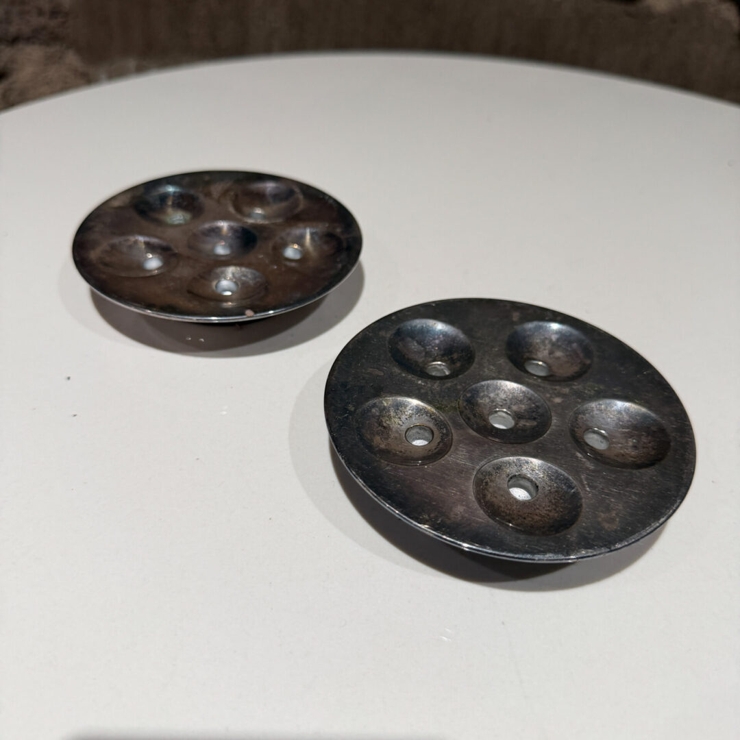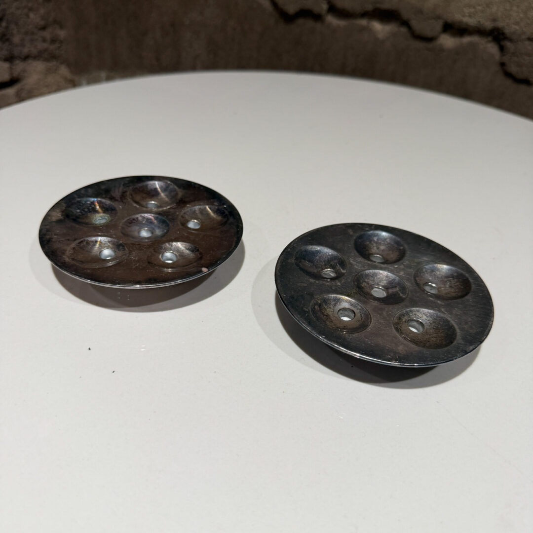 Designed by Jens Harald Quistgaard (JHQ) for Dansk Designs, these mid-century modern pieces are typically made of silver-plated zinc or brass. They are specifically crafted to hold tiny taper candles (often referred to as “slim” or “pencil” tapers) in their six small holes. Sold as a set of two> Two set available.