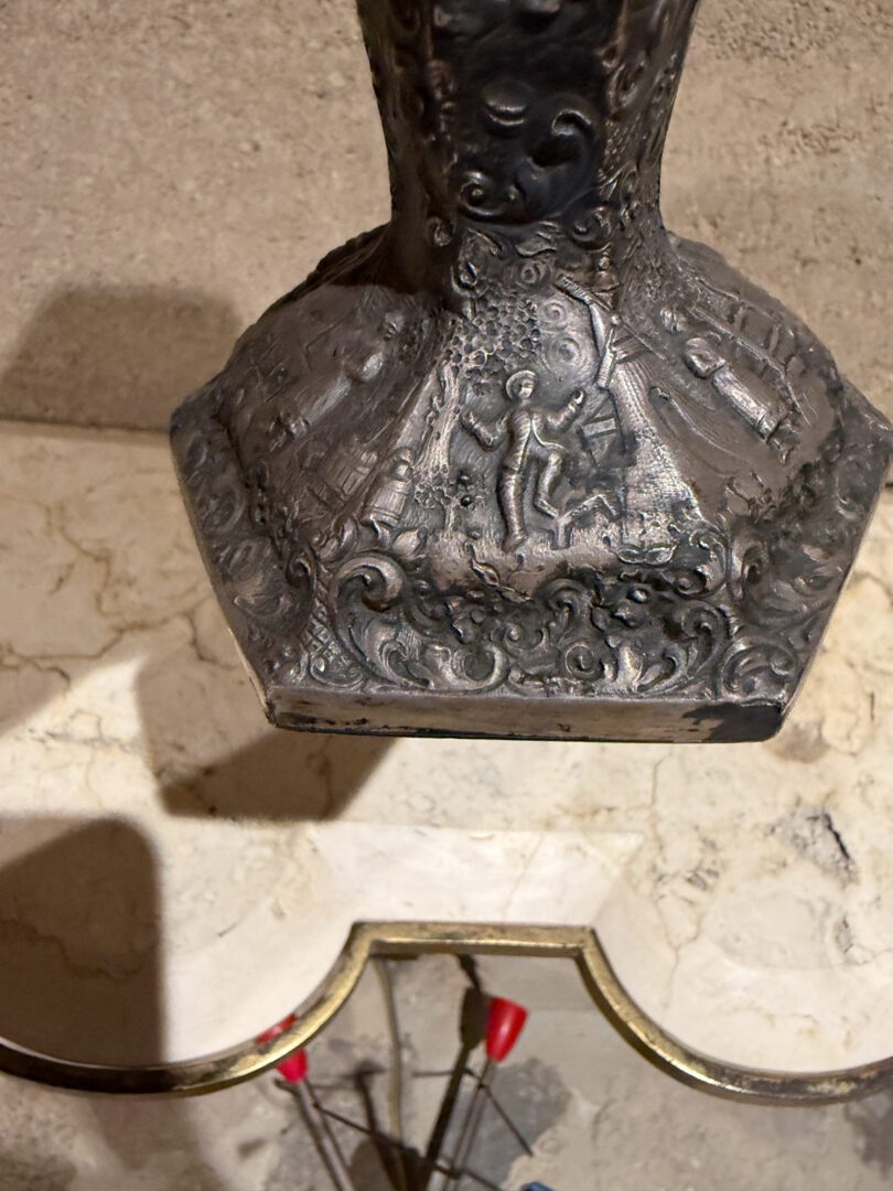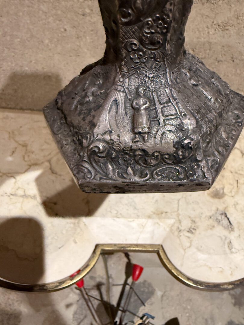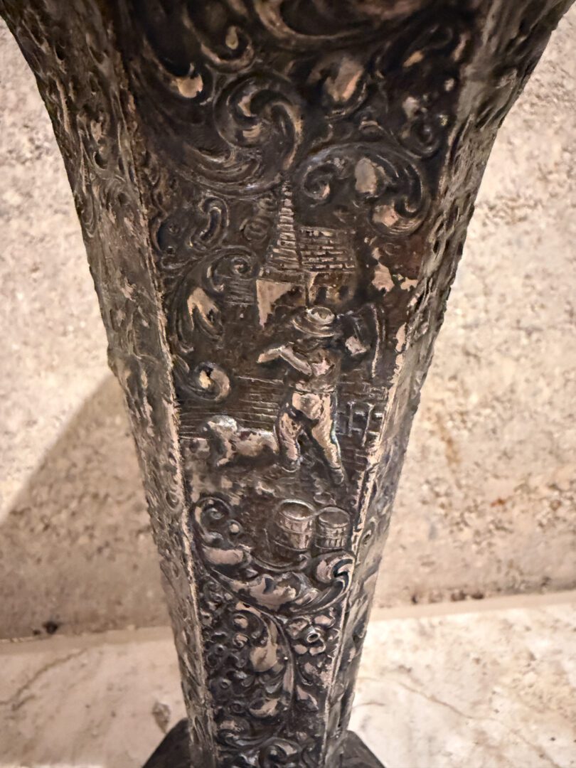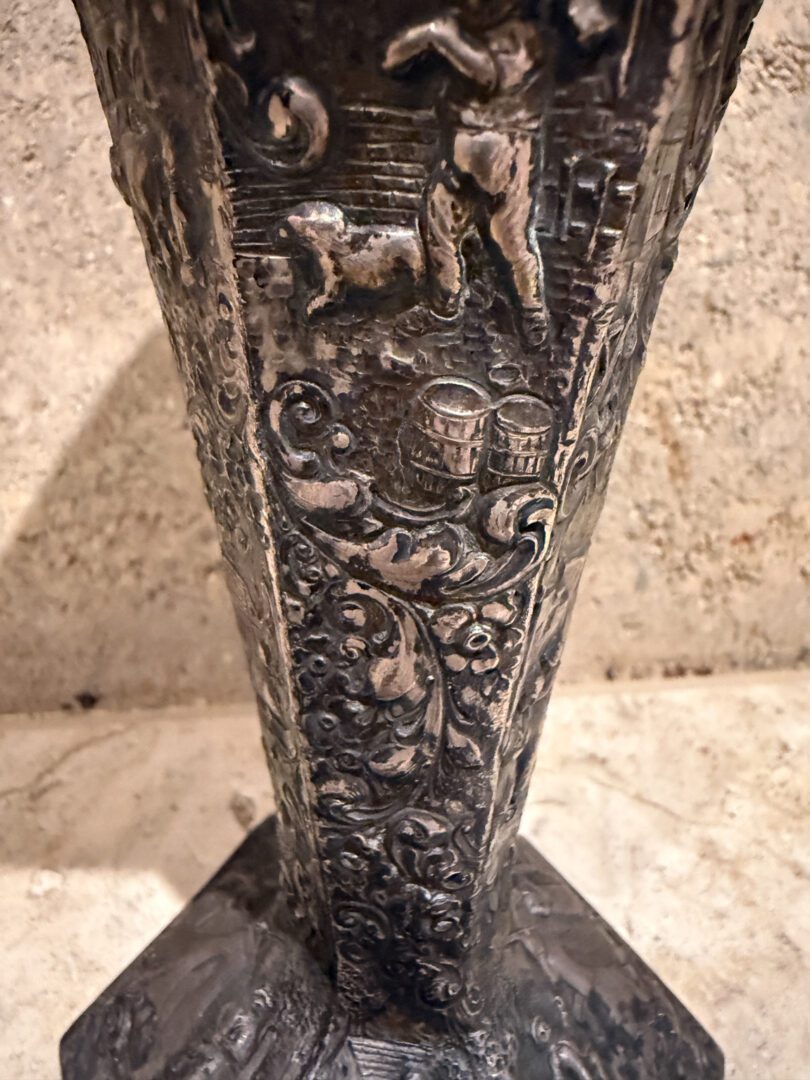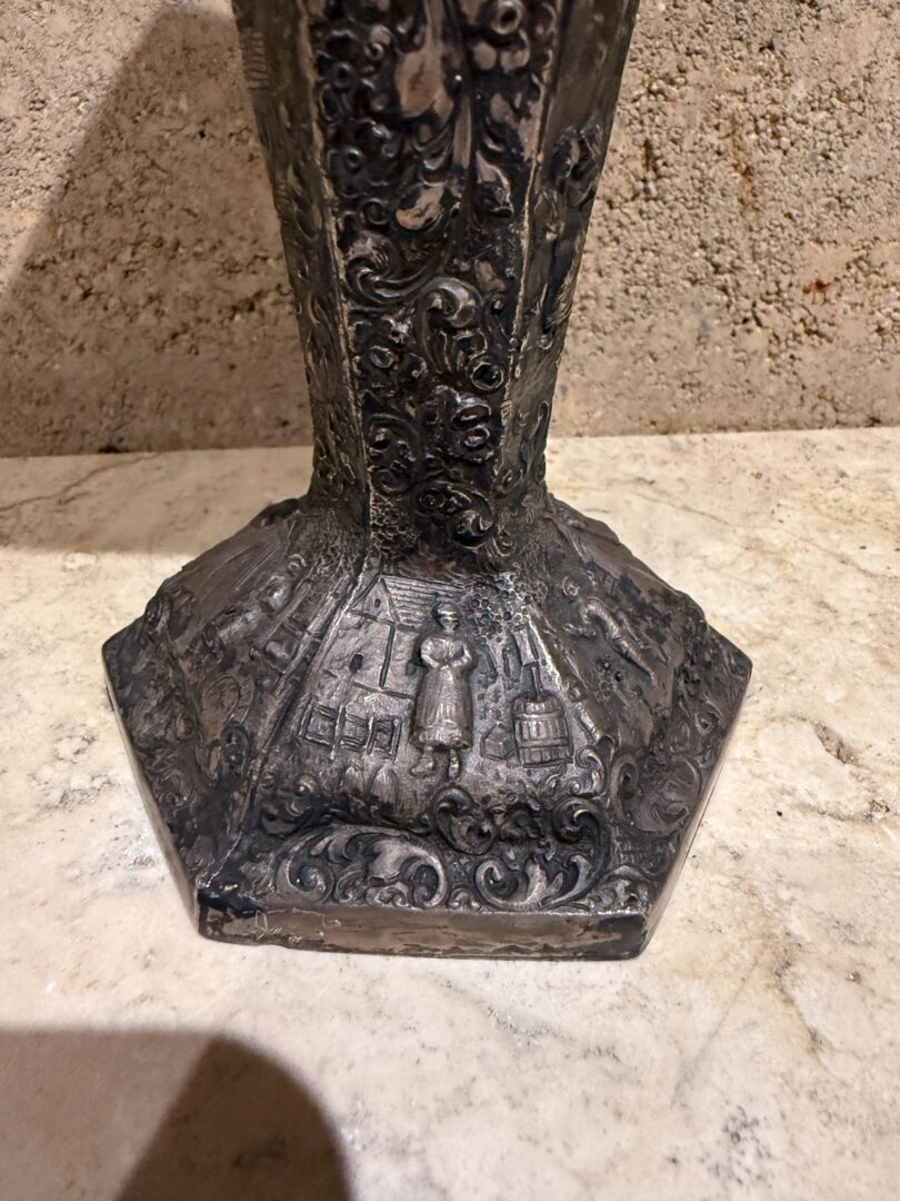 For your consideration an European peasant motif silver plated on repousse copper vase , Circa 1800s.