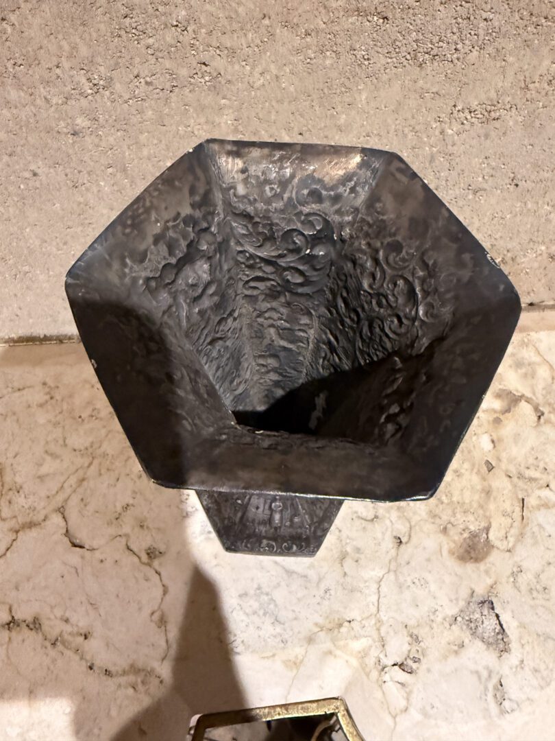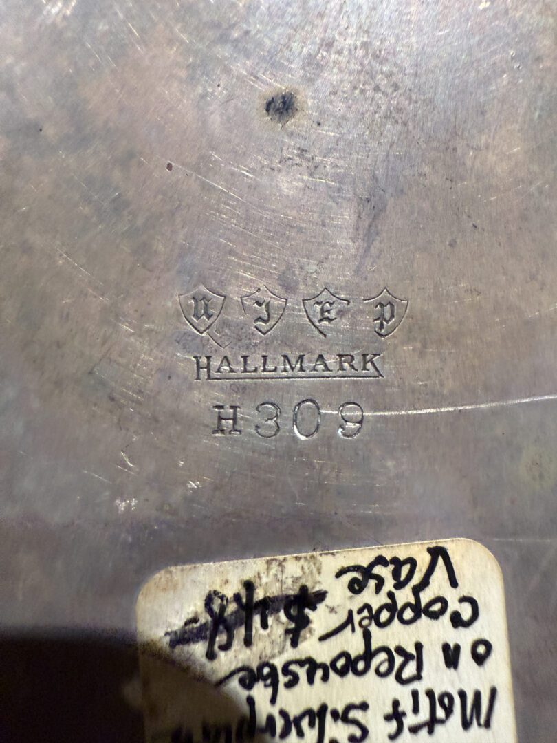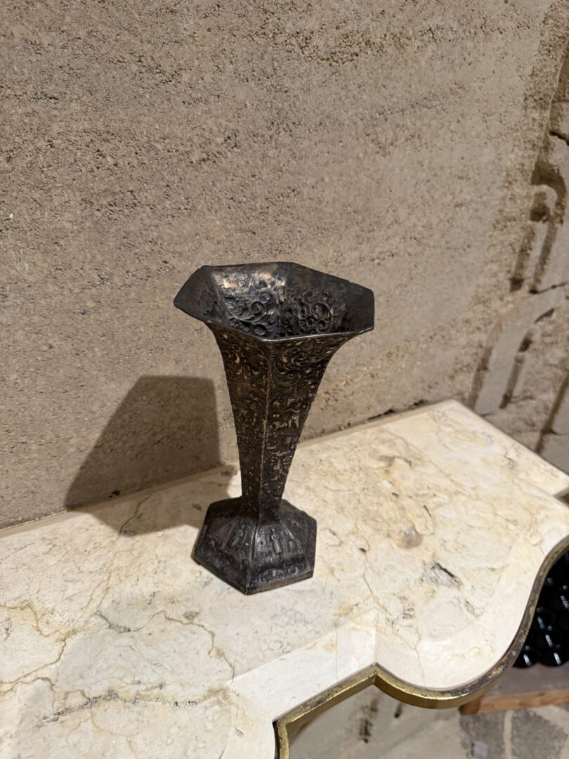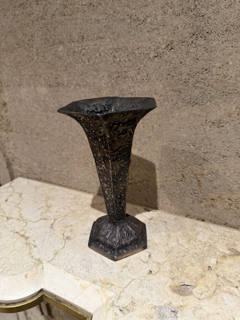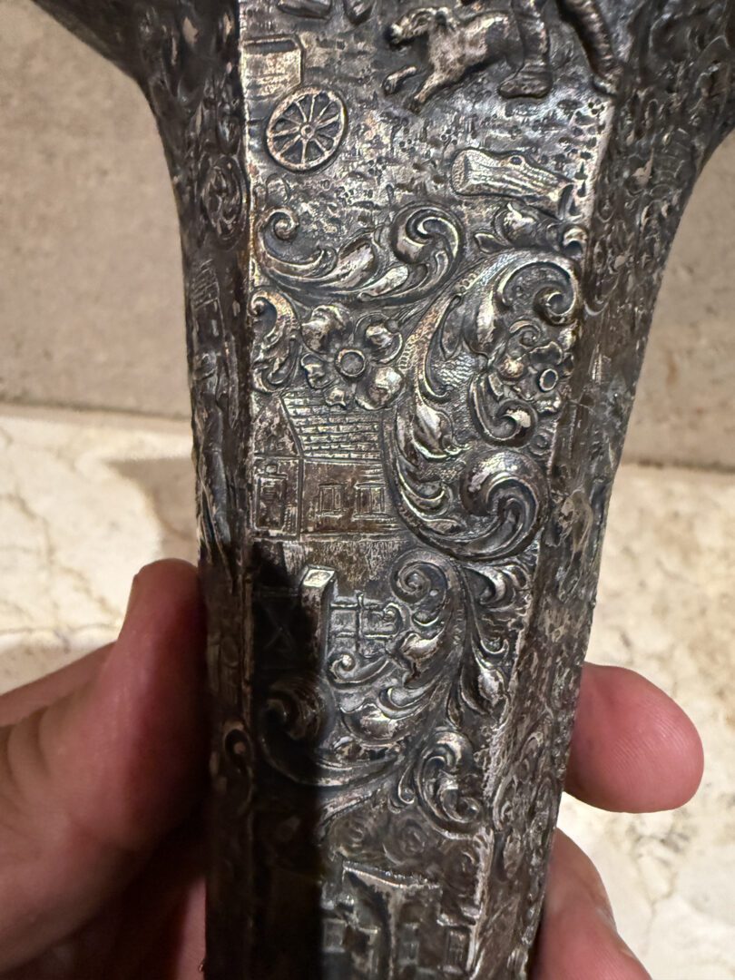 For your consideration an European peasant motif silver plated on repousse copper vase , Circa 1800s.