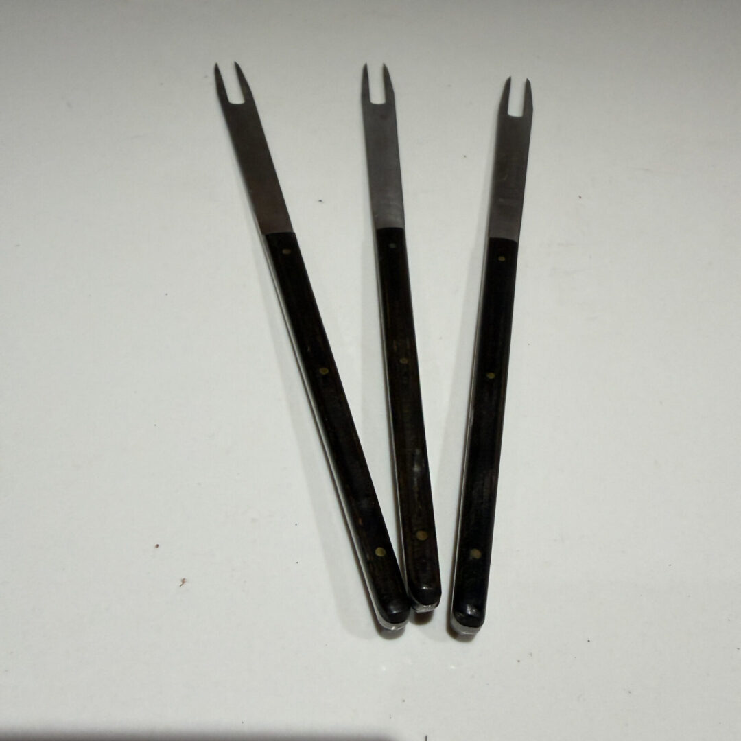 Mid-century modern style featuring two prongs and dark wood or hardwood handles.