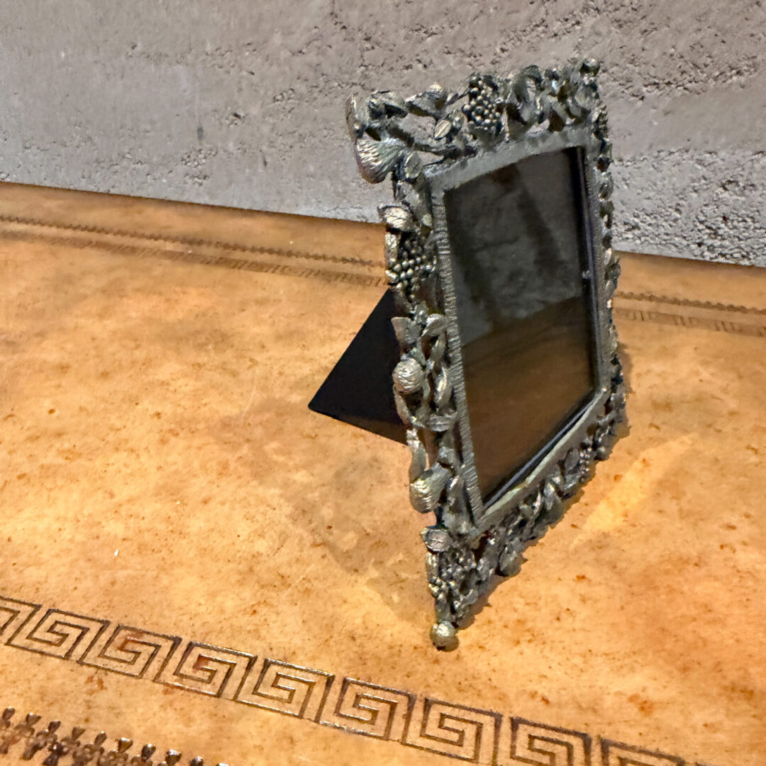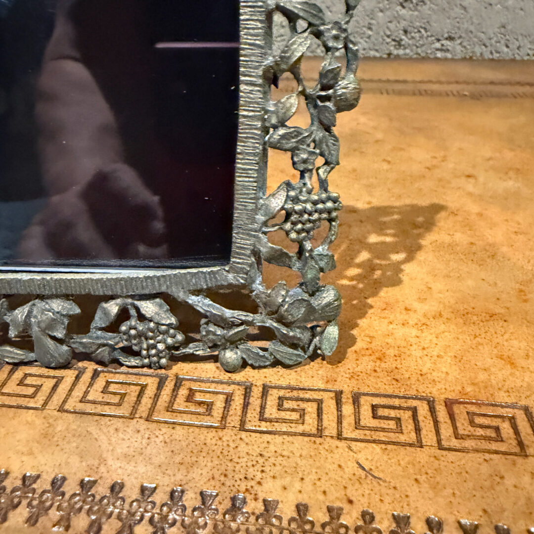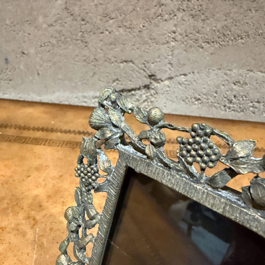 For your consideration, a picture frame with intricate floral and vine design, this vintage-style picture frame is likely made of pewter . Similar frames featuring this “grapes and vines” motif are often associated with brands like Sun Metal, Heritage Metalworks, or Metzke.