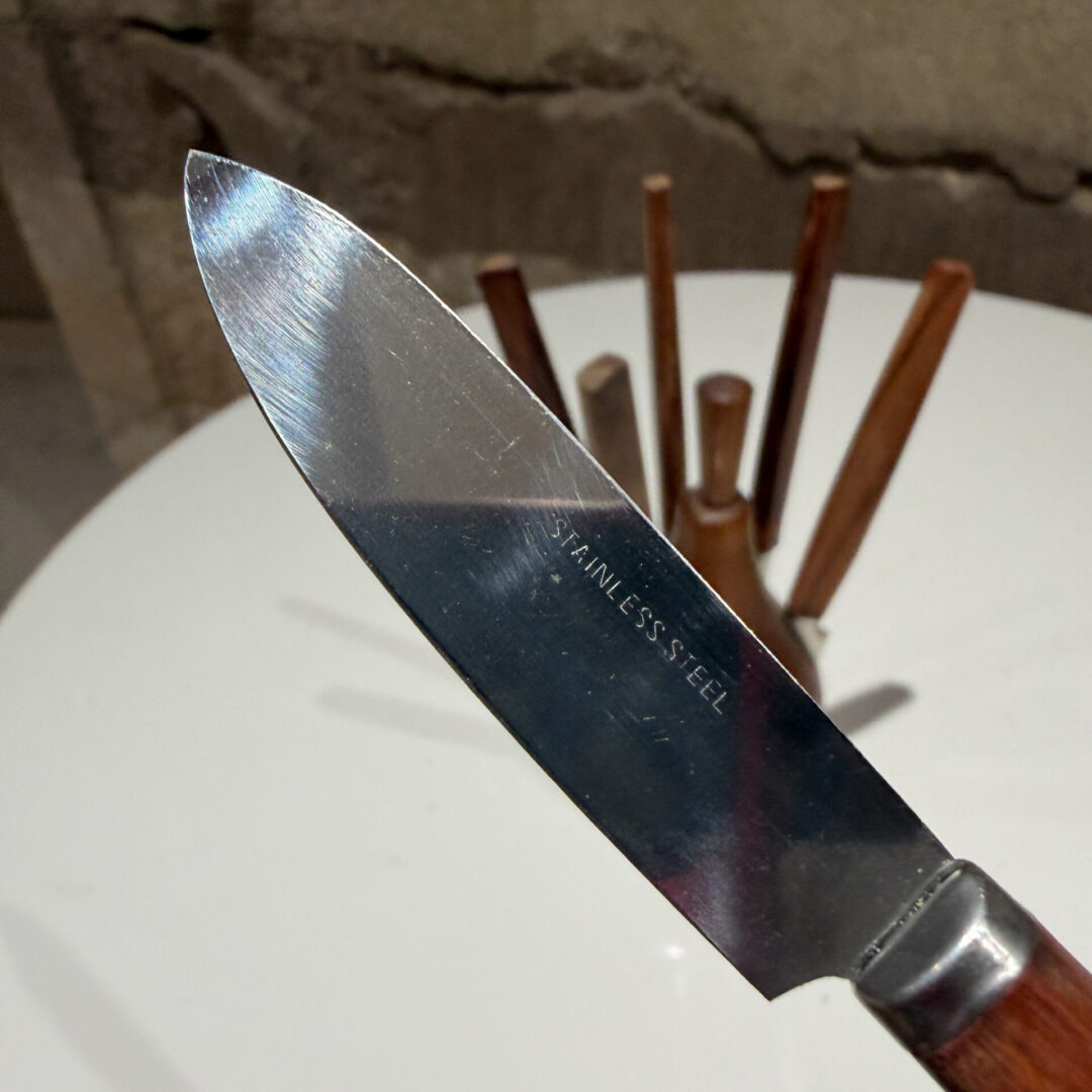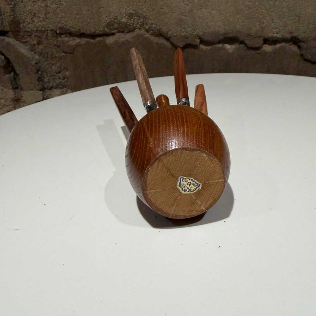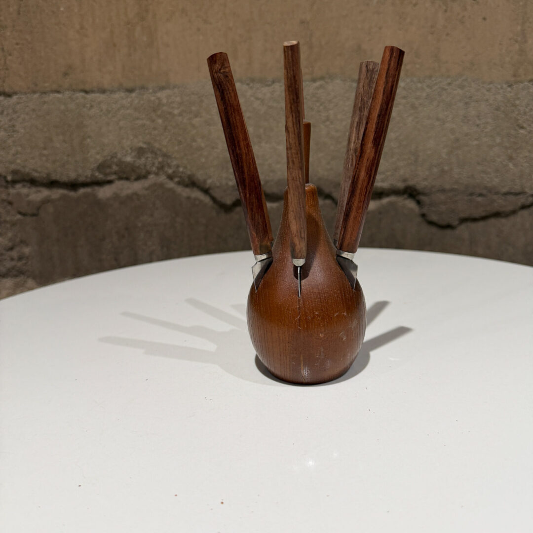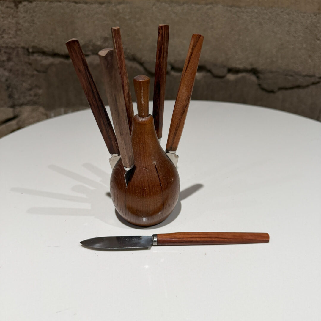 Features a sculptural pear-shaped holder holding six small knives. Stainless steel and teak wood.