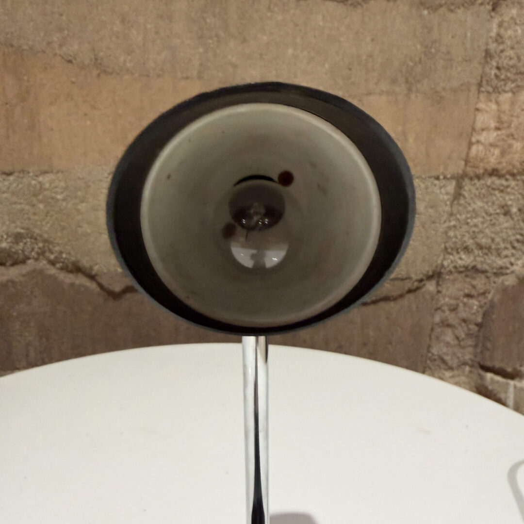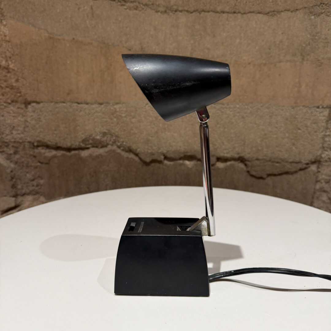 Designed in the late 1960s, it features a characteristic mid-century modern (MCM) aesthetic with a black geometric base, a chrome adjustable arm, and a cone-shaped shade. While often associated with the minimalist styles of designers like Michael Lax or Gerald Thurston, who both designed extensively for Lightolier, this specific “Lyric” model is noted for its compact, functional design.