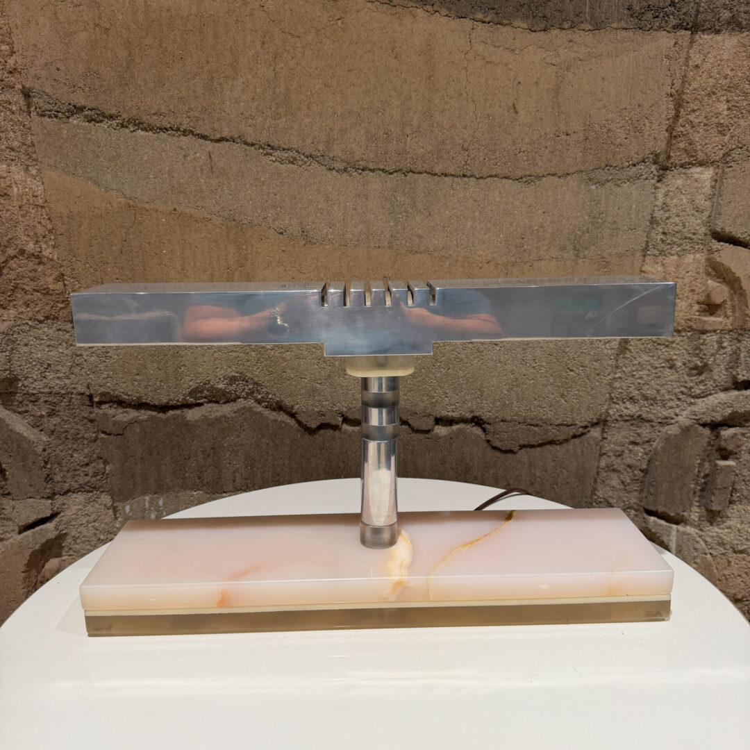 For your consideration, a Mid-Century Modern desk lamp, likely originating from the 1950s or 1970s. It features a distinctive combination of a long, rectangular polished aluminum shade and a luxurious stone or marble base.