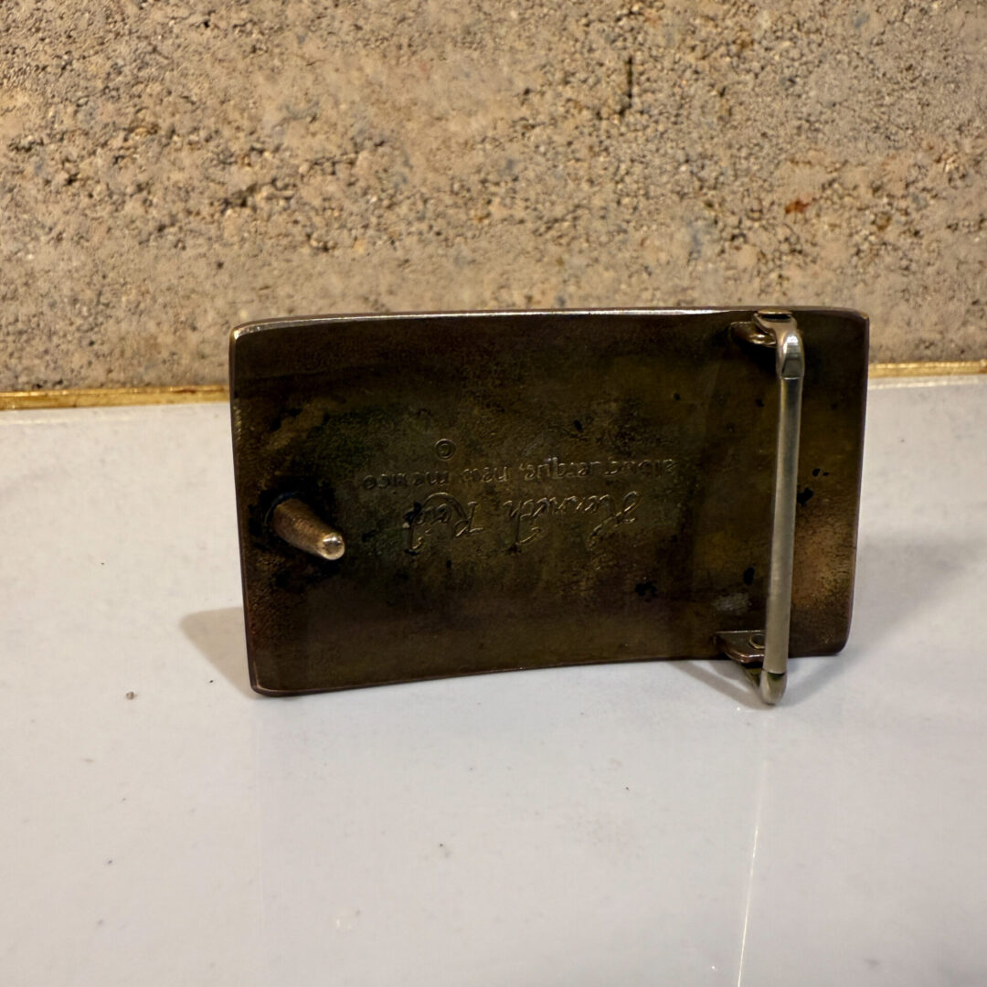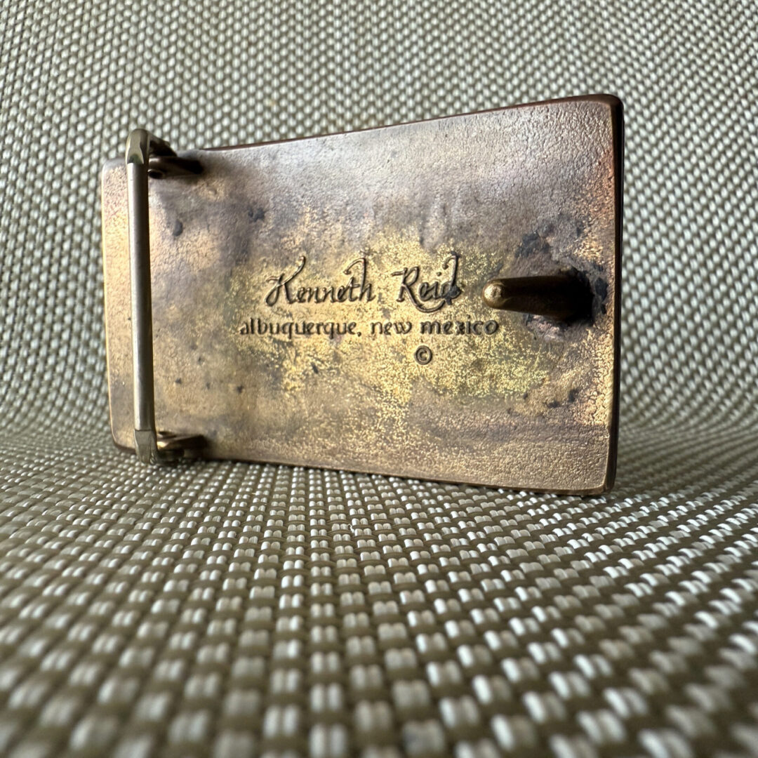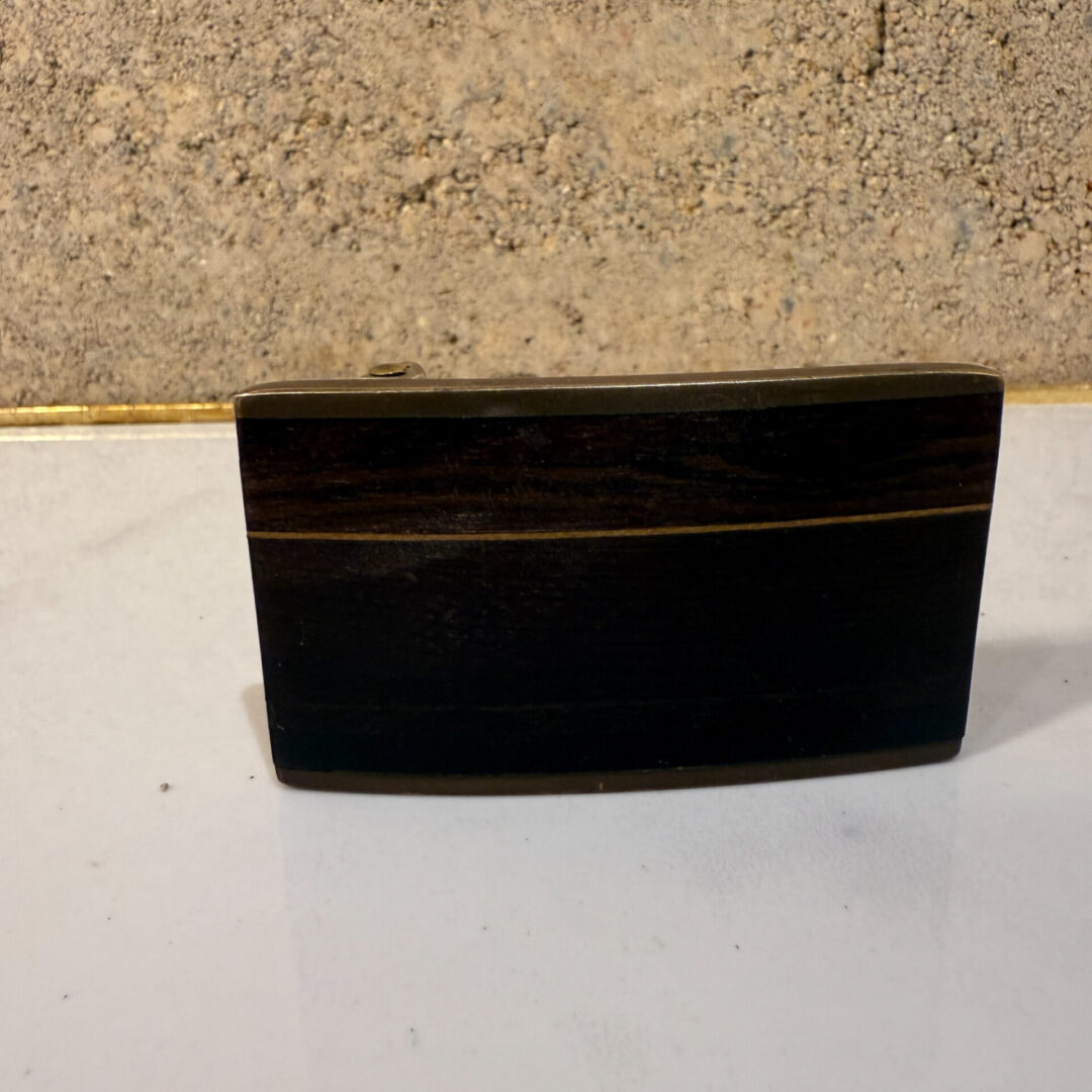 For your consideration, a vintage mid-century modern buckle belt by Kenneth Reid with dark woods. Solid brass.