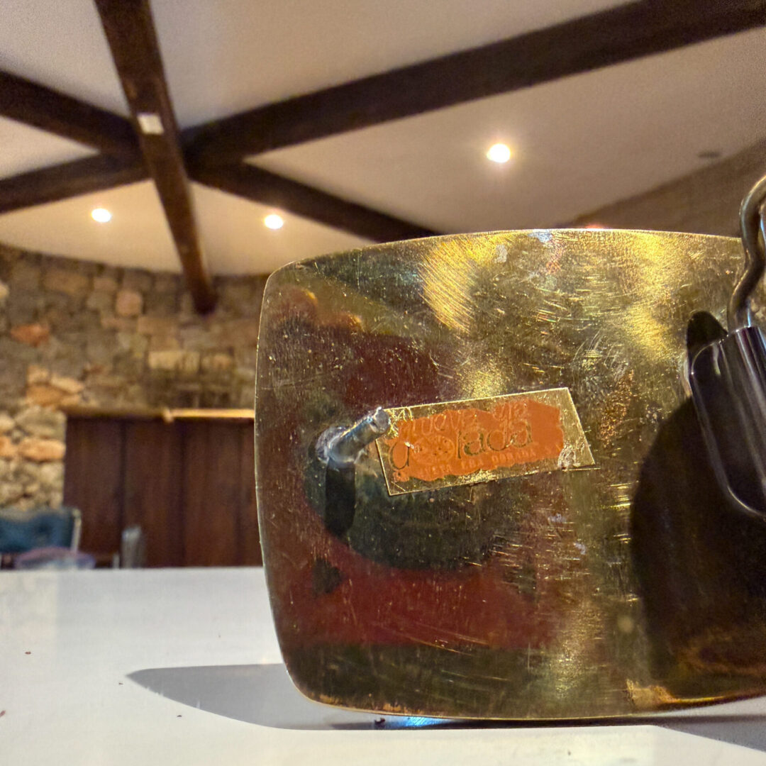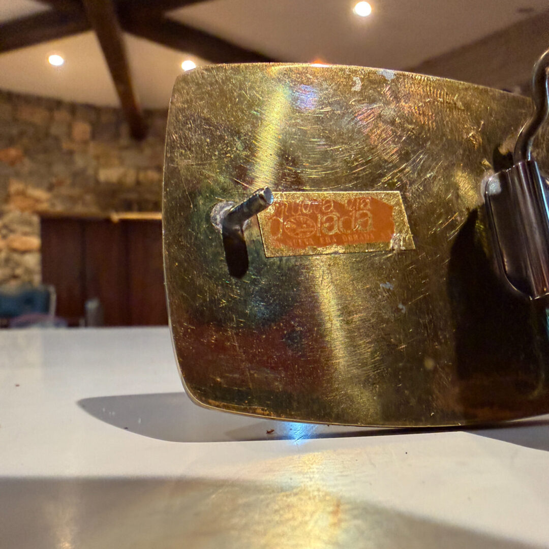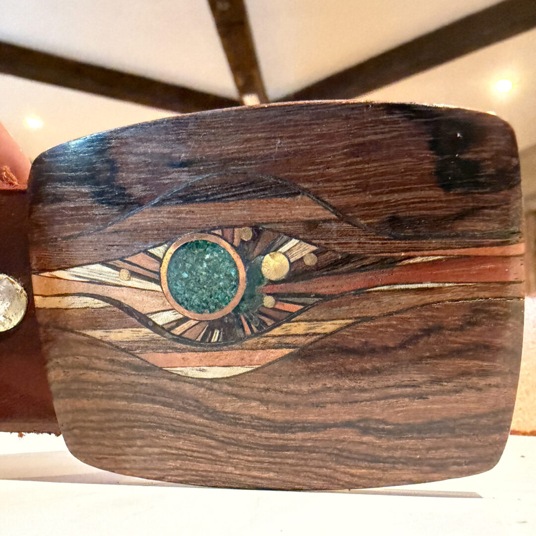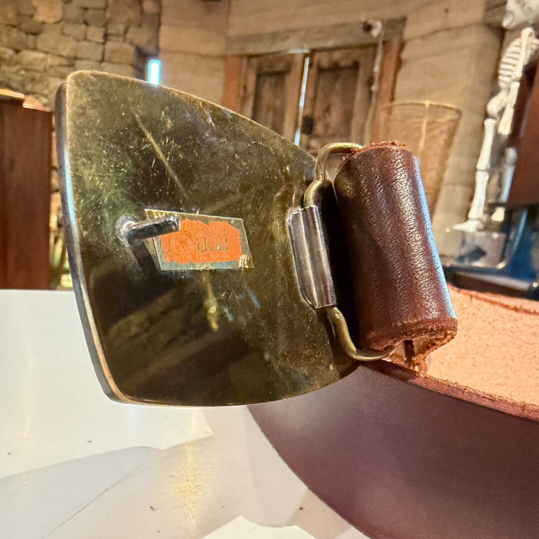 For your consideration, a vintage modernist buckle belt “La Nueva Era Dorada”. Brass with walnut wood and stones.