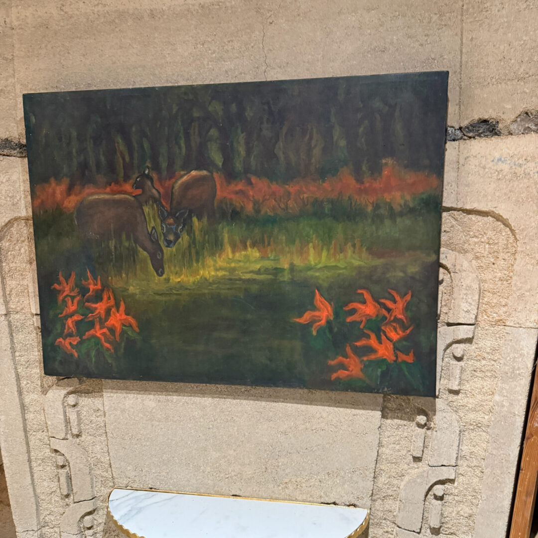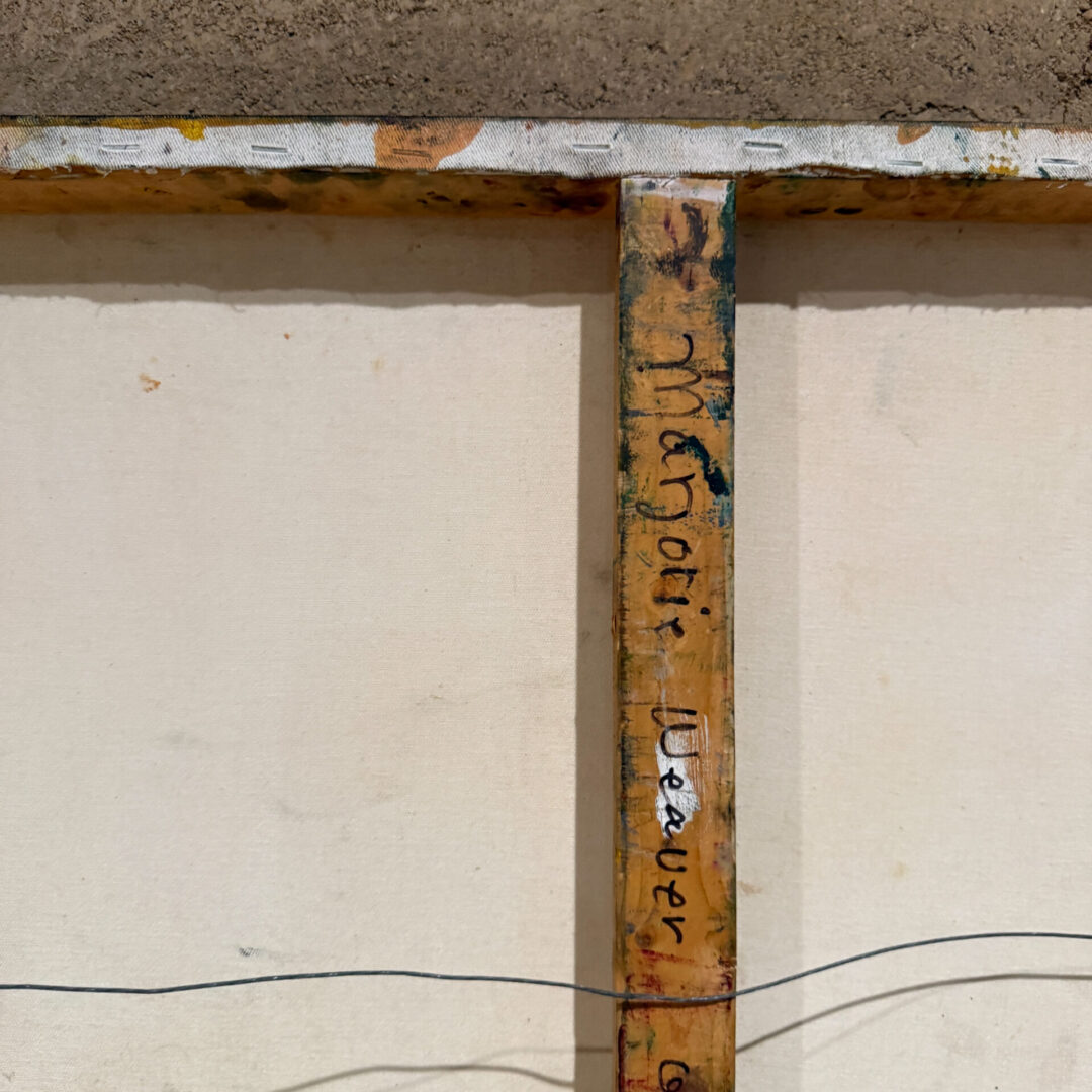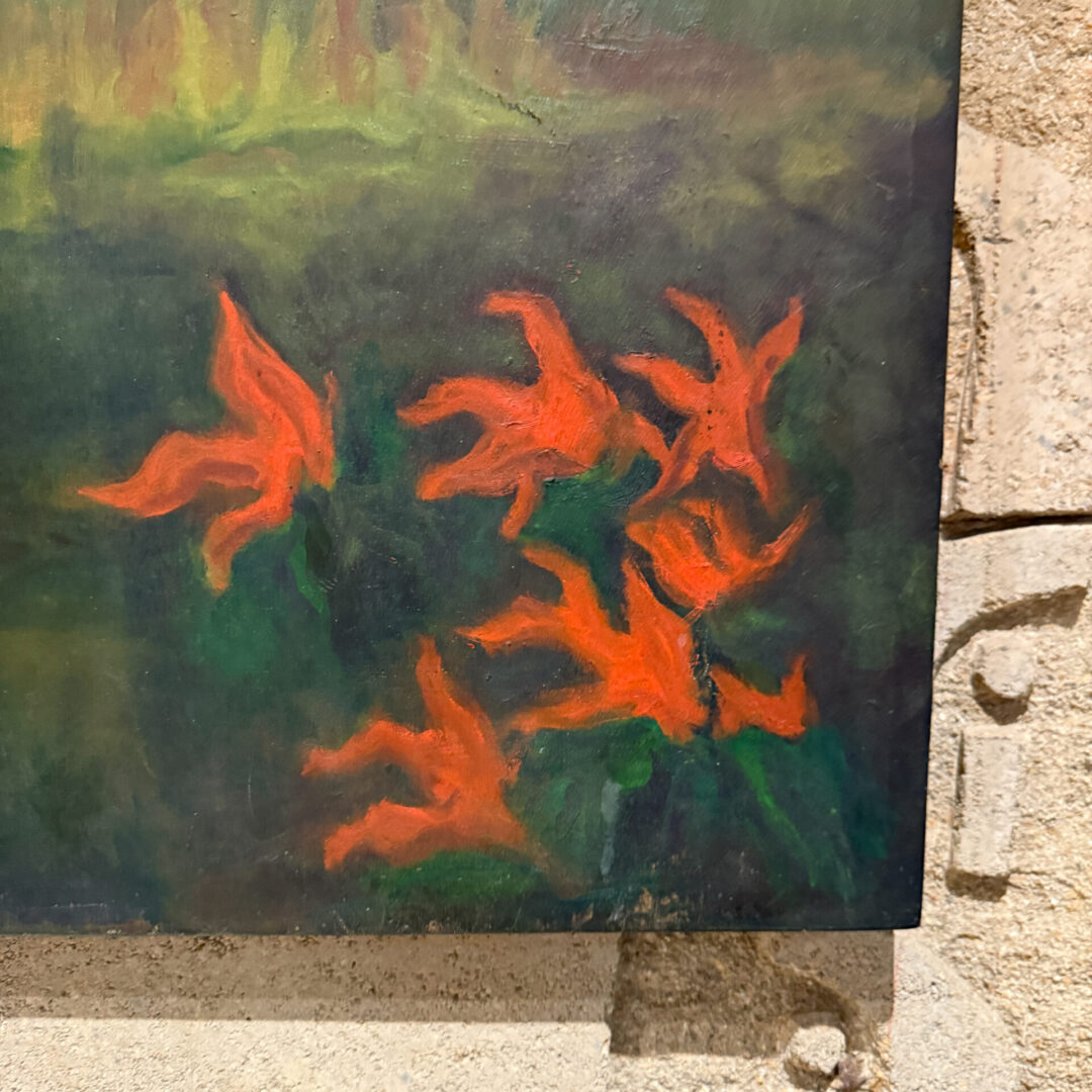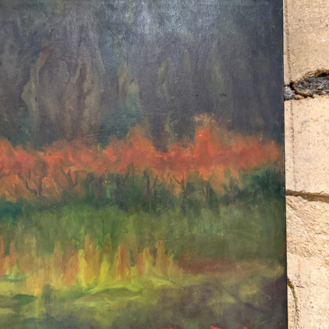 For your consideration, a vintage painting oil on canvas by Marjorie Weaver. Folk art landscape still life.