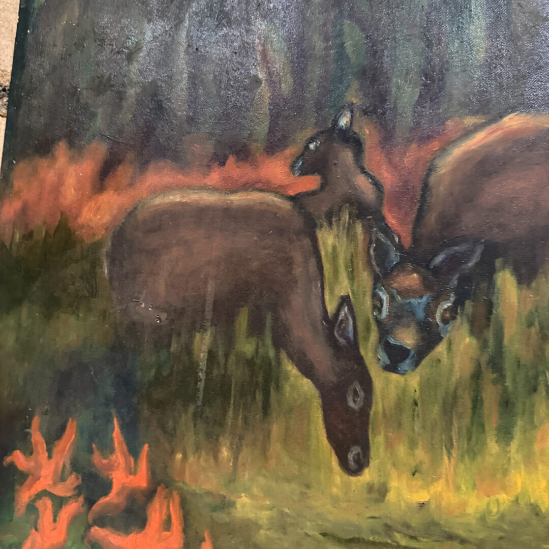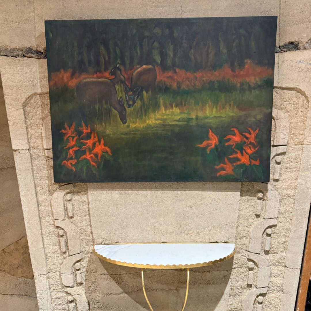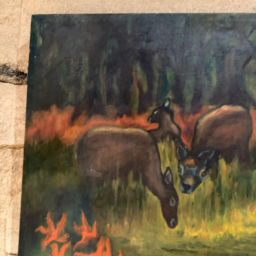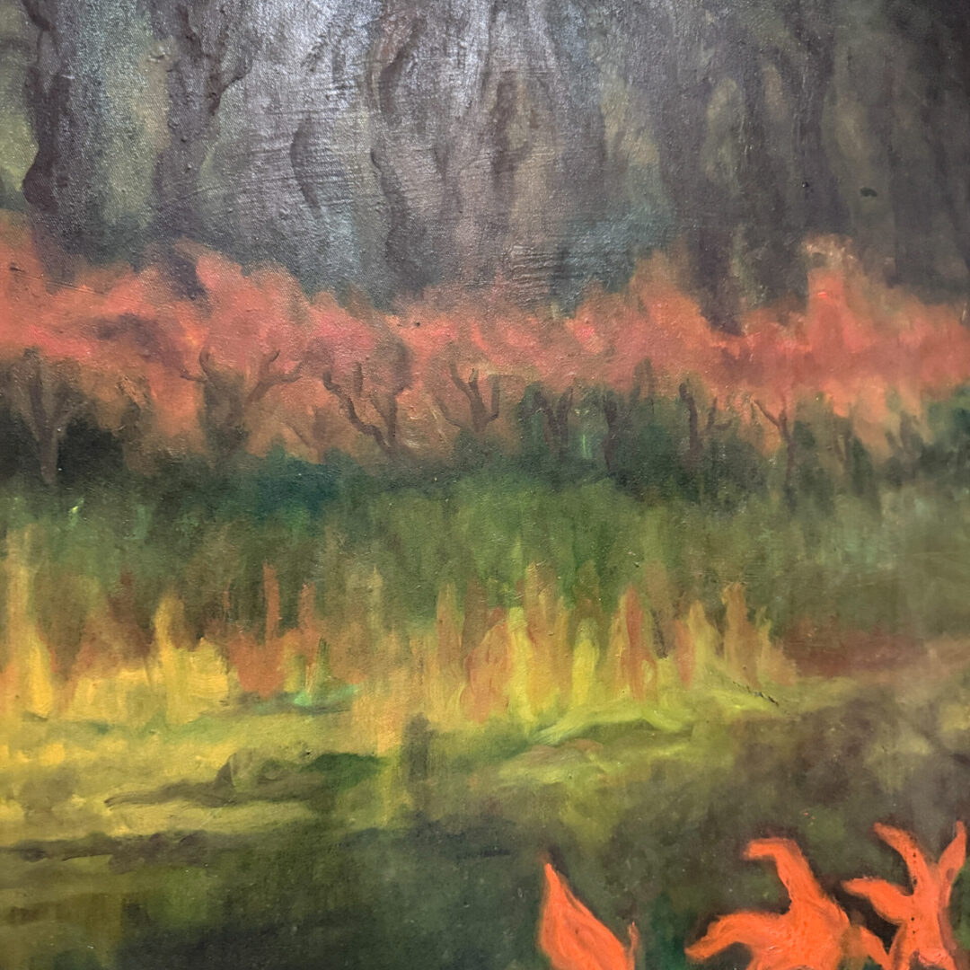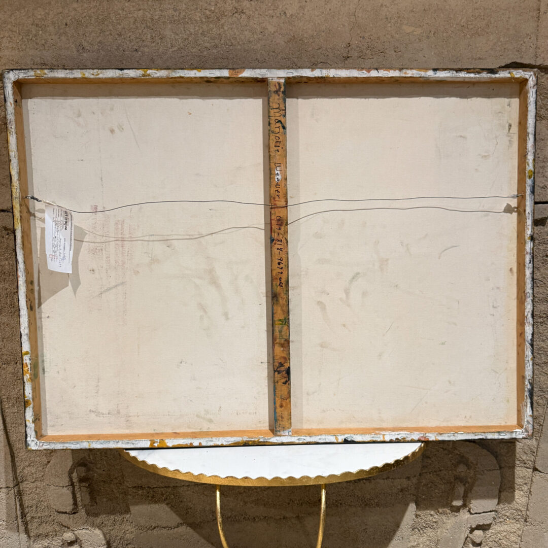 For your consideration, a vintage painting oil on canvas by Marjorie Weaver. Folk art landscape still life.