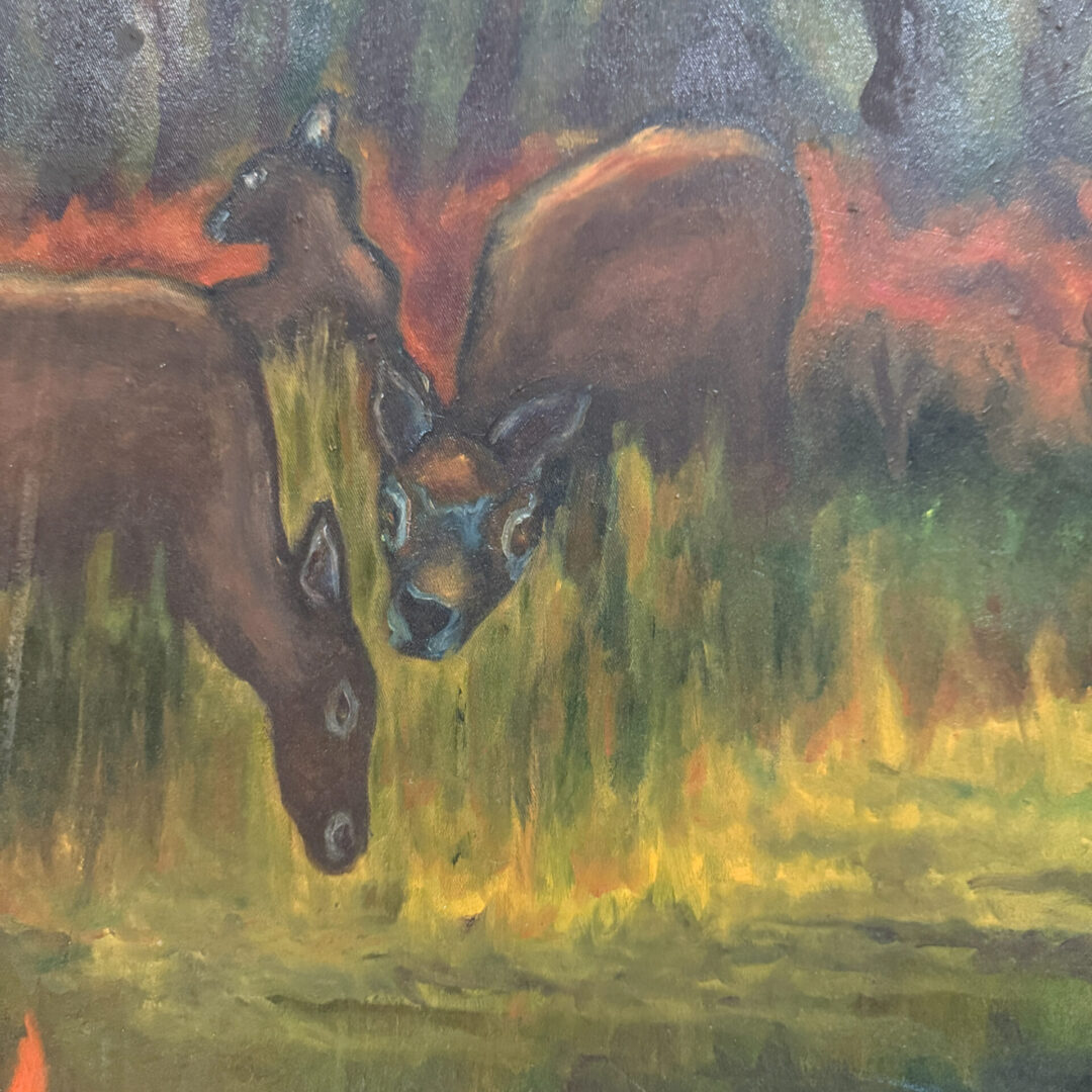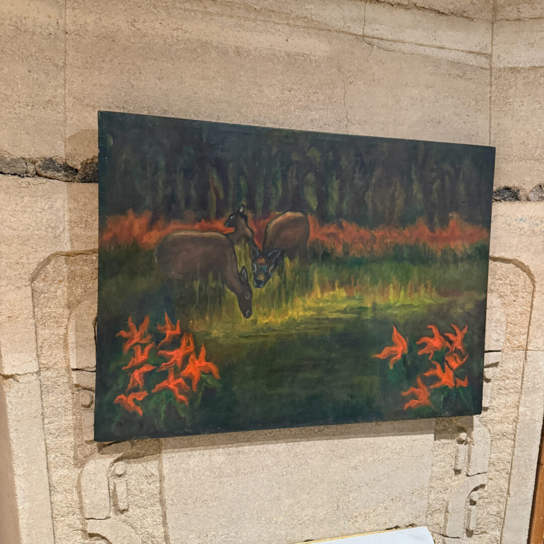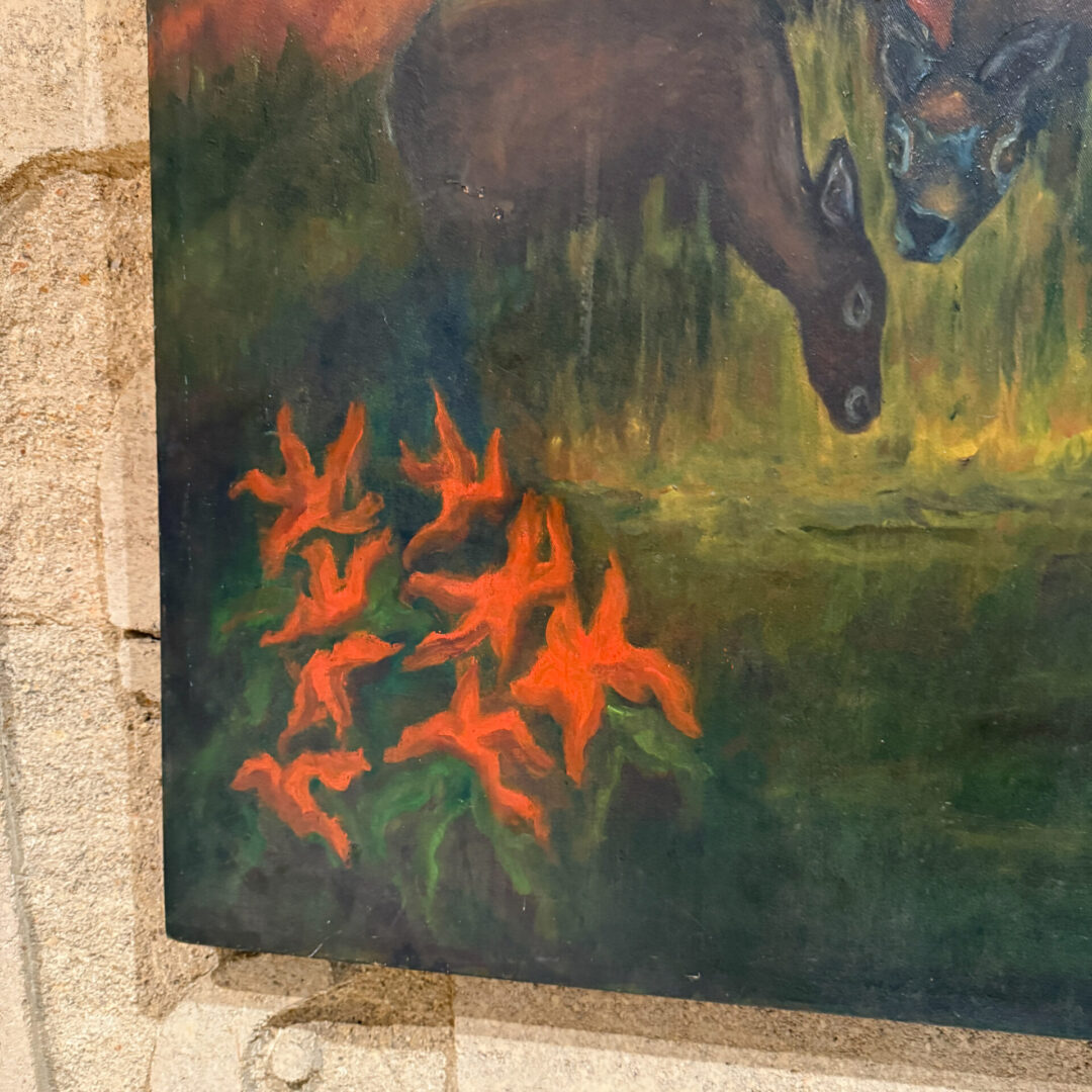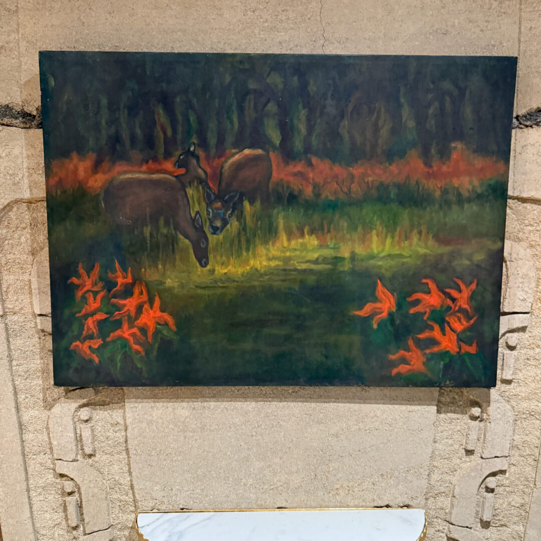 For your consideration, a vintage painting oil on canvas by Marjorie Weaver. Folk art landscape still life.