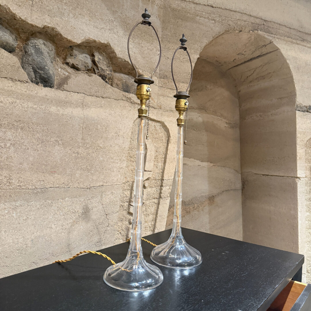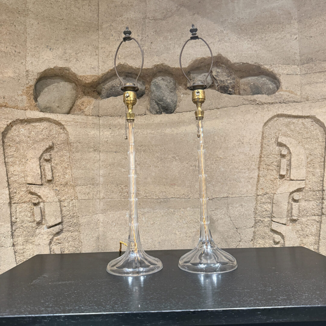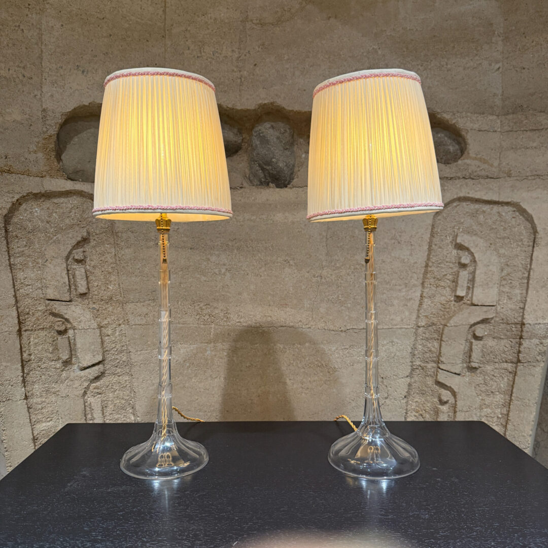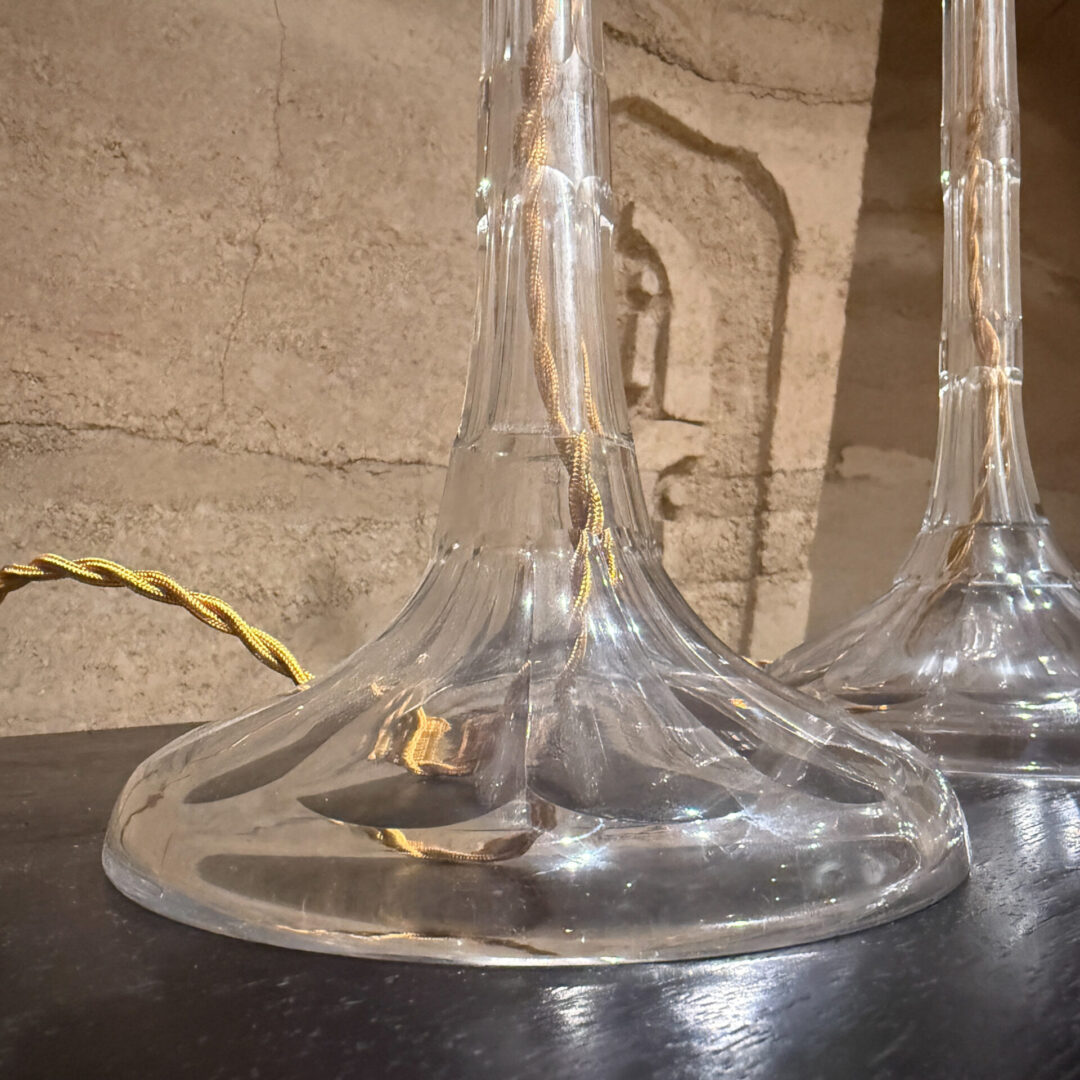 For your consideration, a pair of French table lamps. Constructed with crystal clear glass. Art Deco period. Rewired. Includes original shades. No label present from the maker.