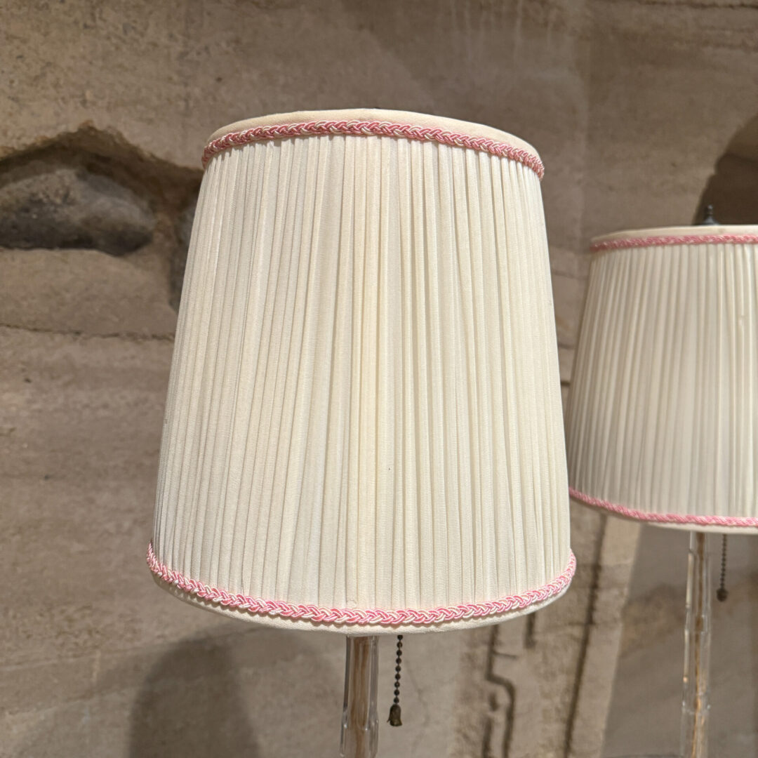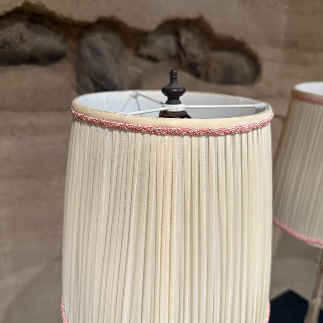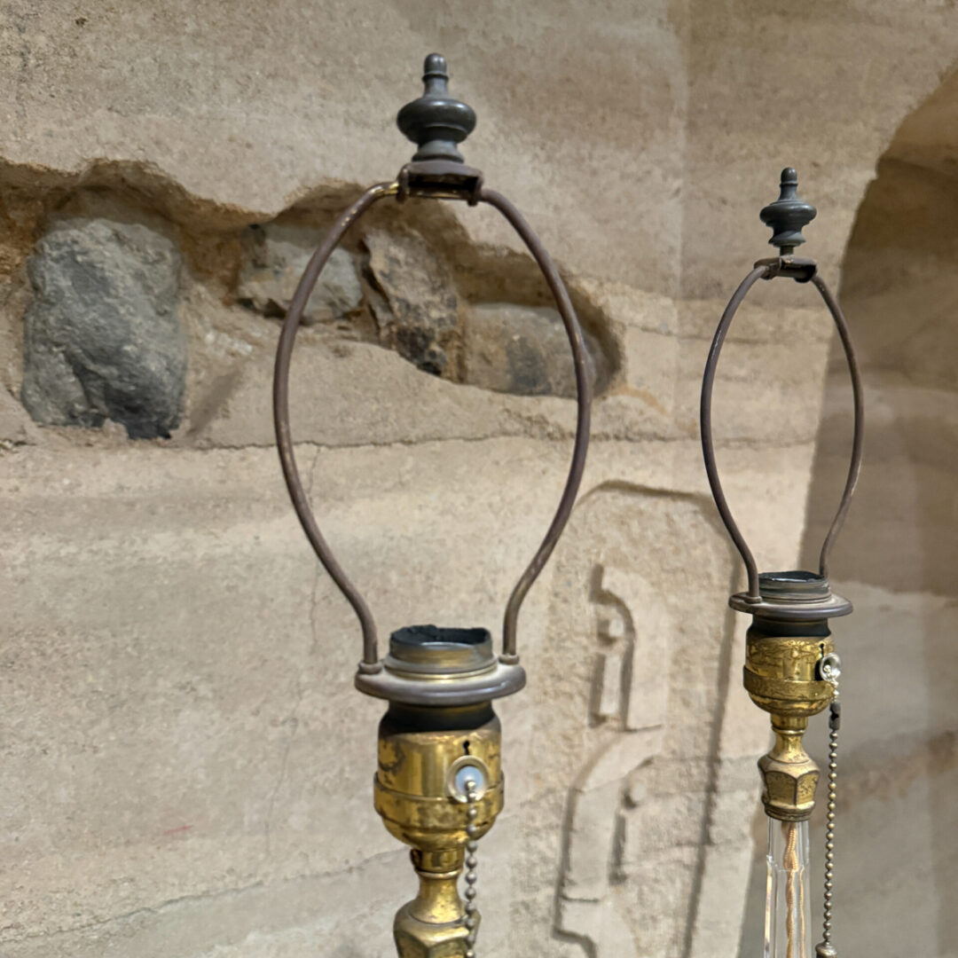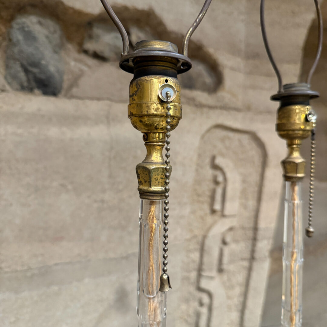 For your consideration, a pair of French table lamps. Constructed with crystal clear glass. Art Deco period. Rewired. Includes original shades. No label present from the maker.