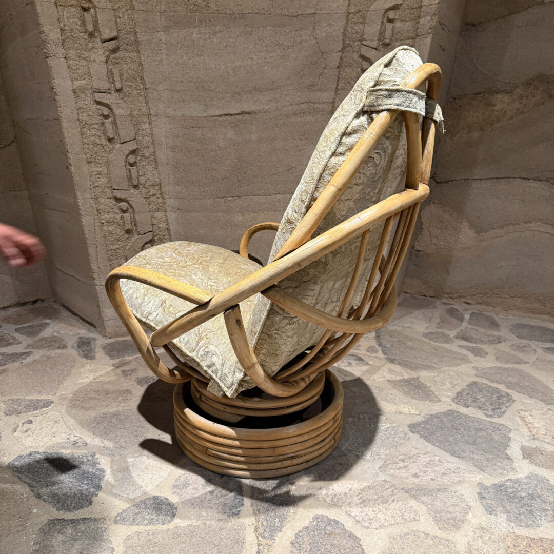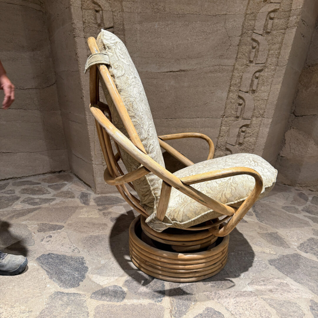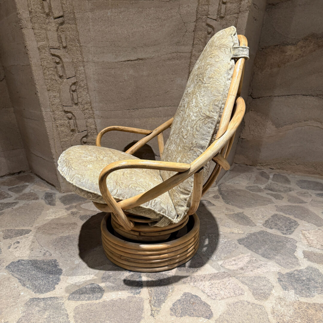 For your consideration, a swivel bucket lounge chair on stacked rattan bamboo pedestal base .Mid-Century period. USA circa the 1970s. New upholstery cushion with fresh upholstery in tan color.