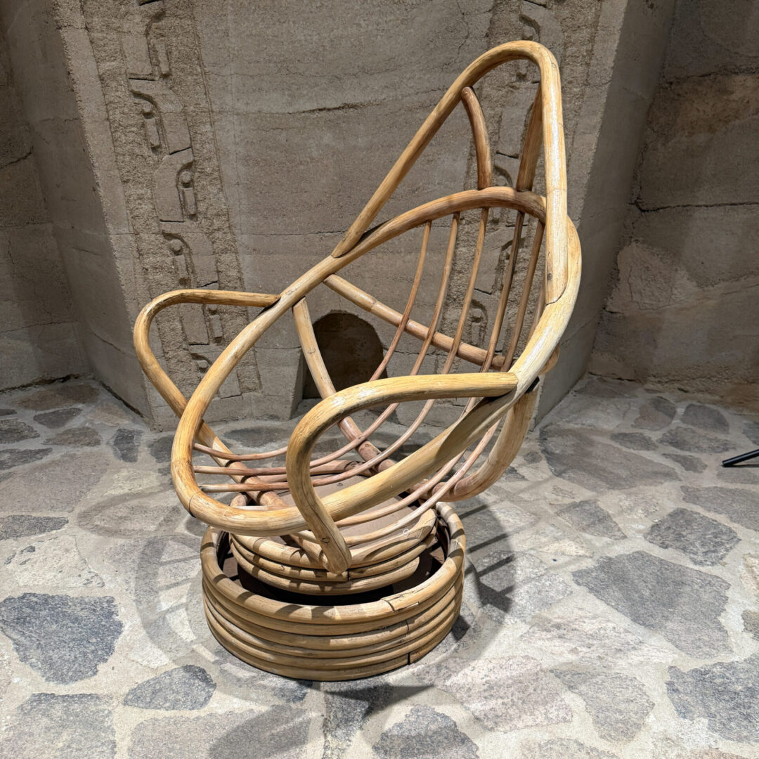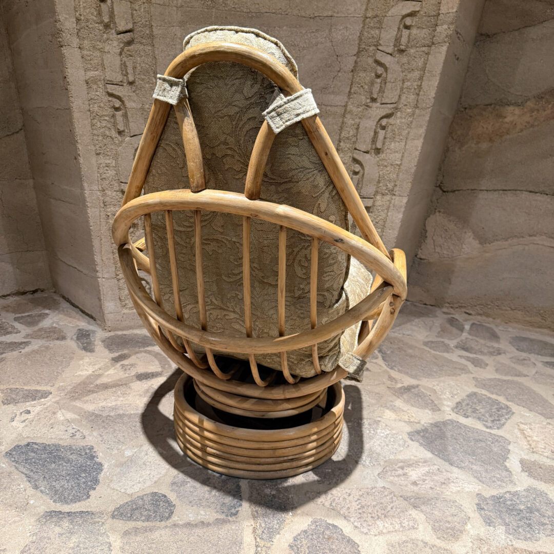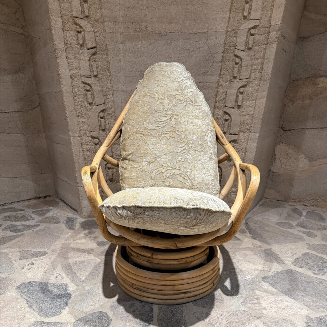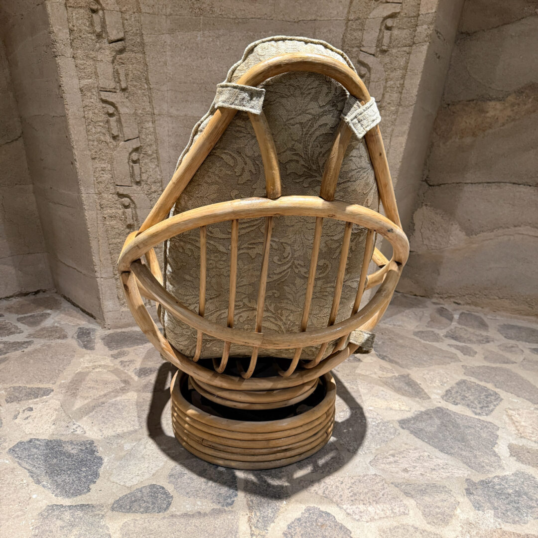 For your consideration, a swivel bucket lounge chair on stacked rattan bamboo pedestal base .Mid-Century period. USA circa the 1970s. New upholstery cushion with fresh upholstery in tan color.