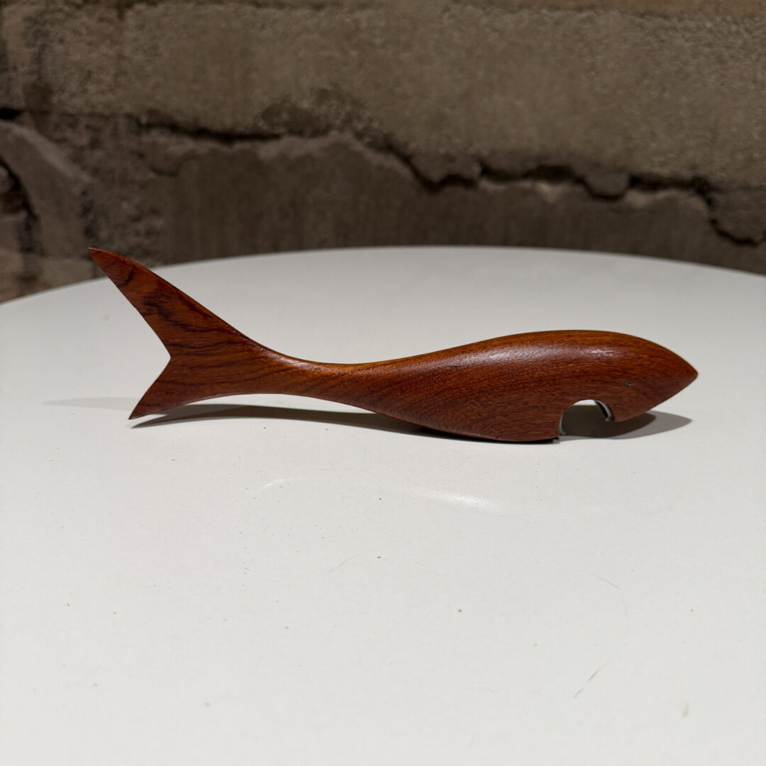 For your consideration, a collectible vintage teak wood bottle opener shaped like a fish or shark, likely designed in Denmark during the mid-century modern era.