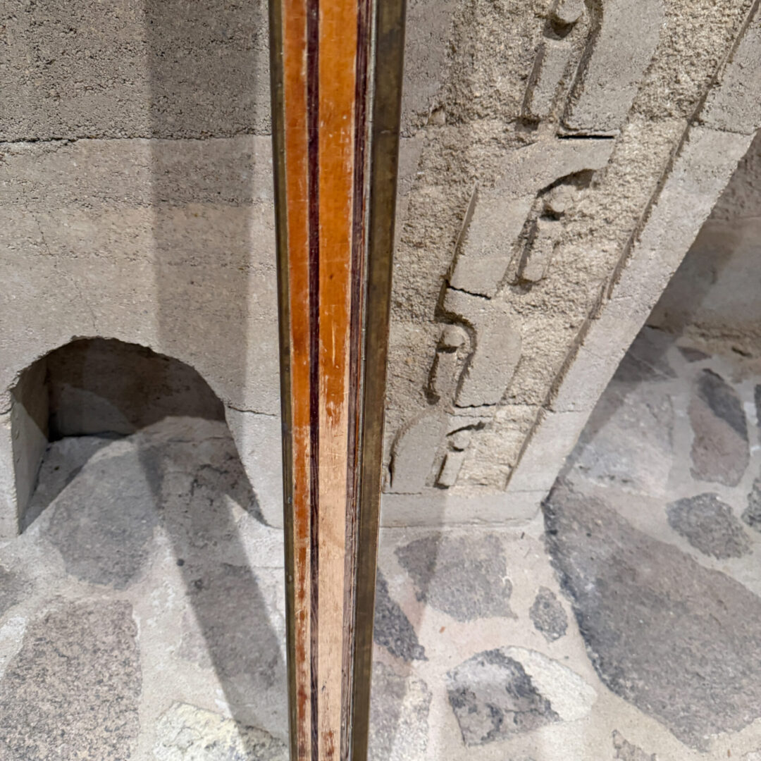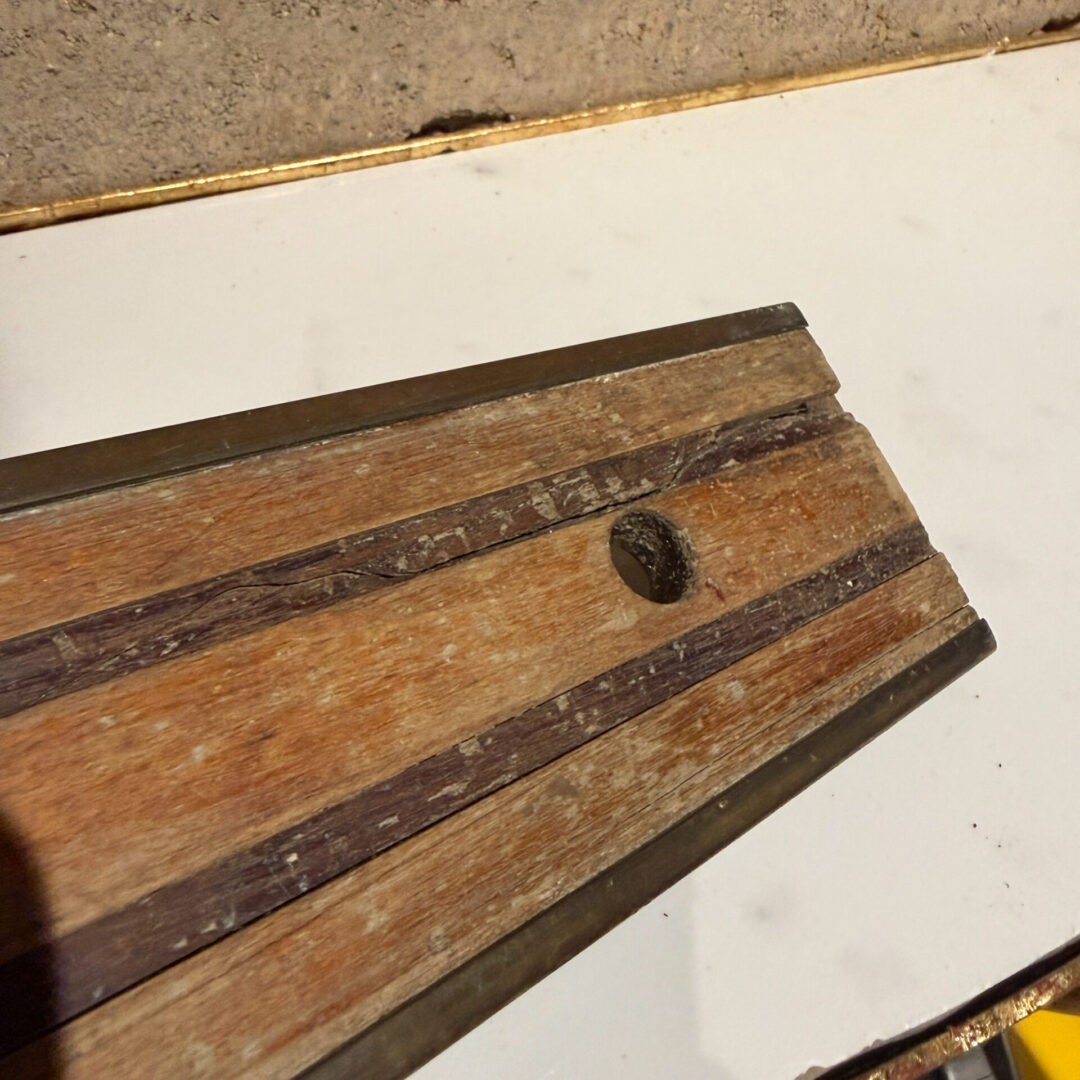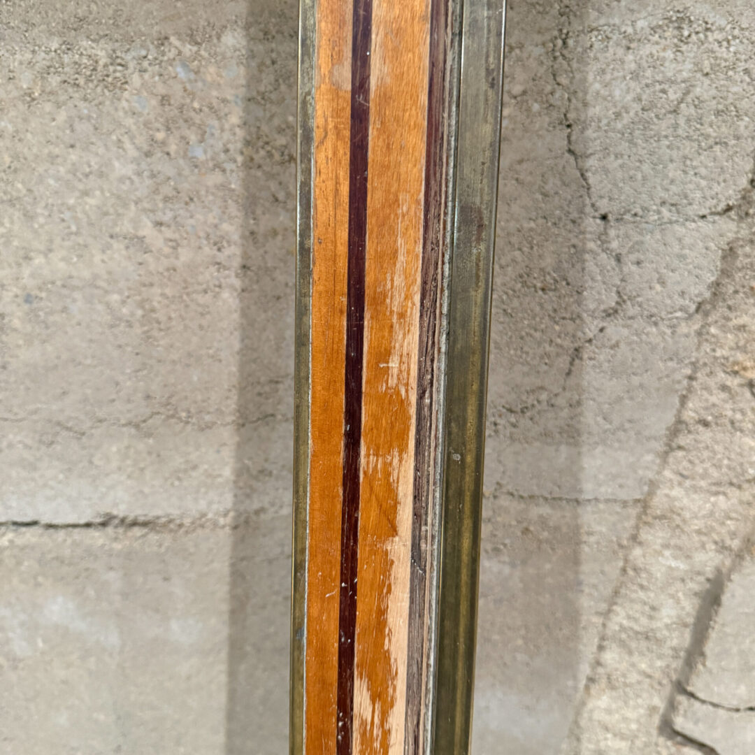 Constructed with brass and wood (tow kinds, one light and one dark. Patina present. Finish worn off. Residue of sediment, or paint.