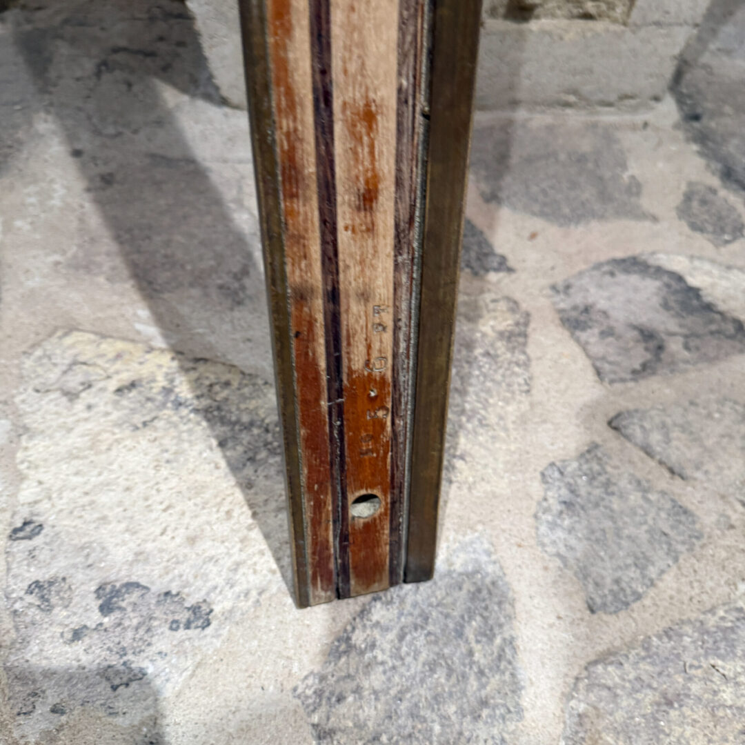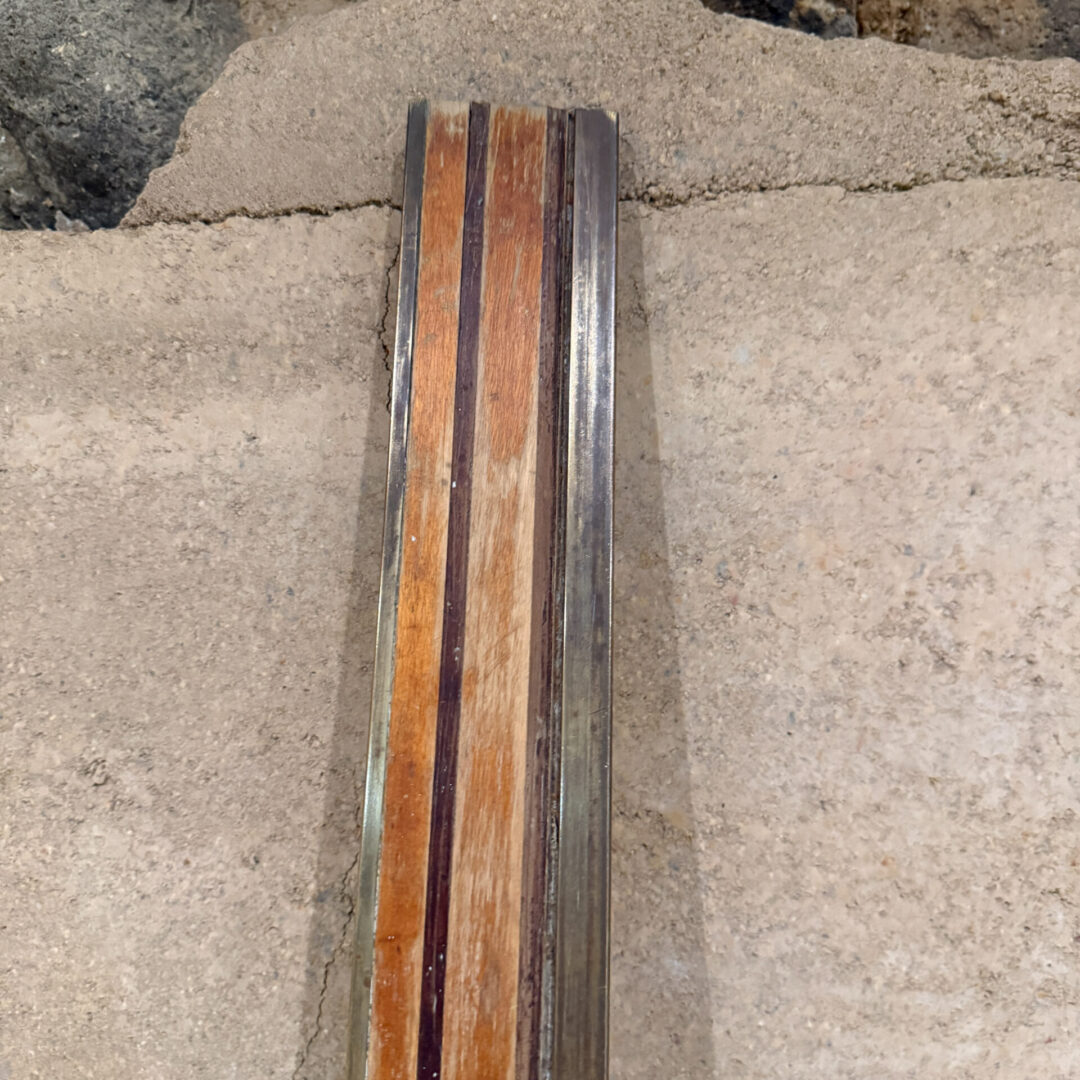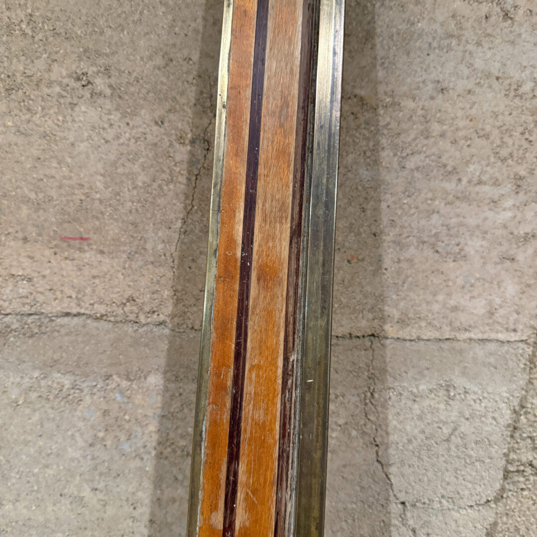 Constructed with brass and wood (tow kinds, one light and one dark. Patina present. Finish worn off. Residue of sediment, or paint.