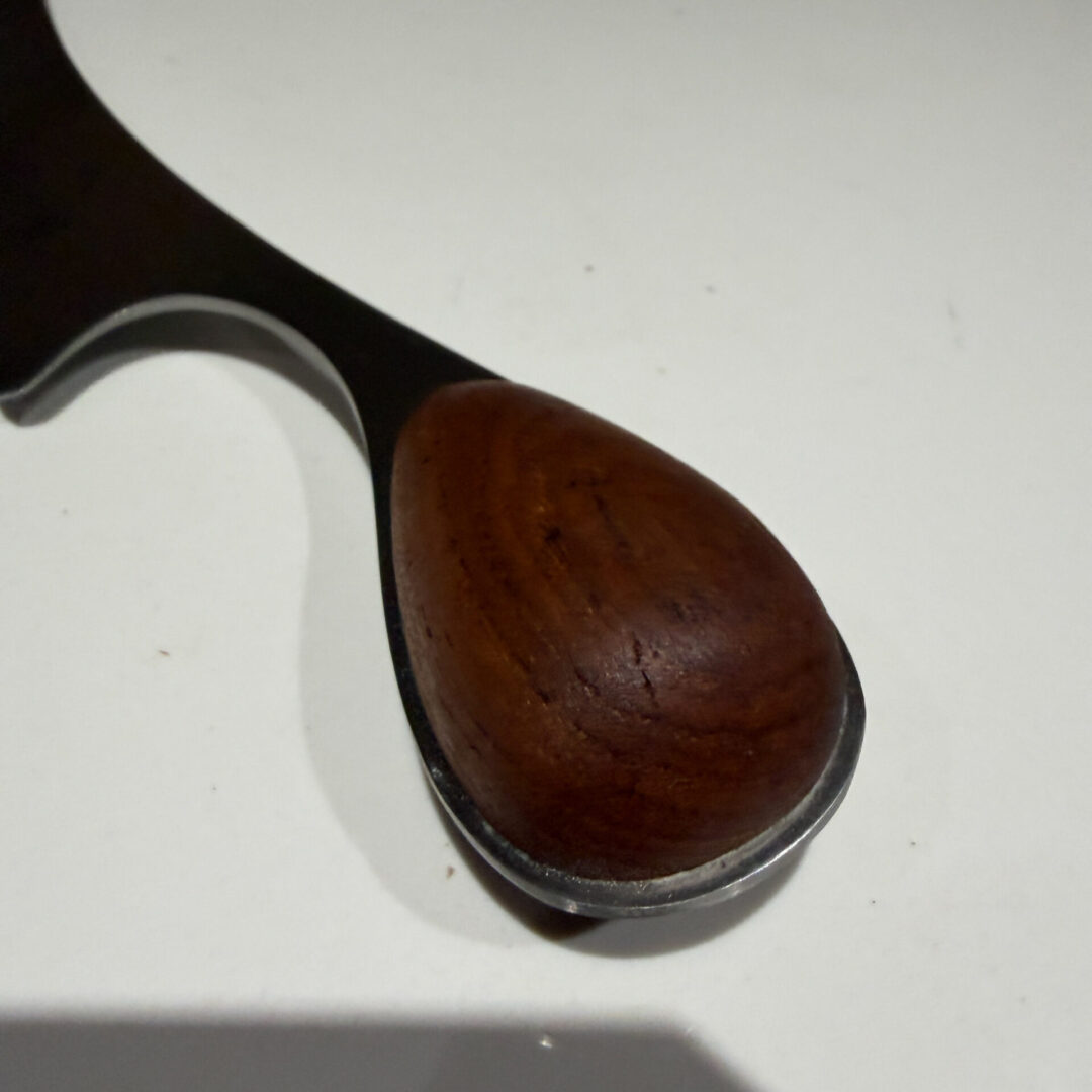 Crafted from stainless steel with a sculptural teak wood handle.