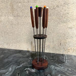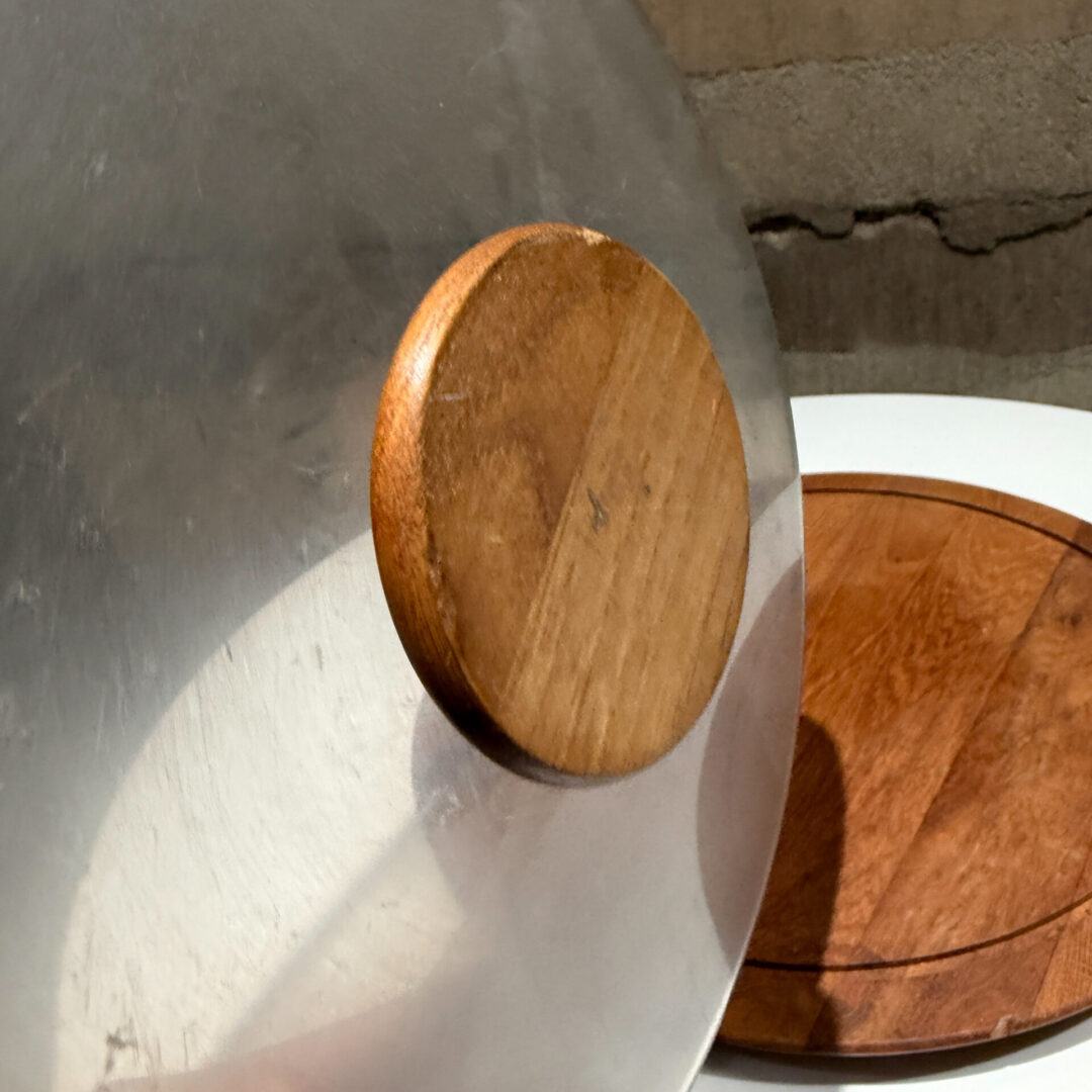 Scandinavian style typically crafted from teak wood, with some models featuring a glass or plastic cloche and a matching teak knob.