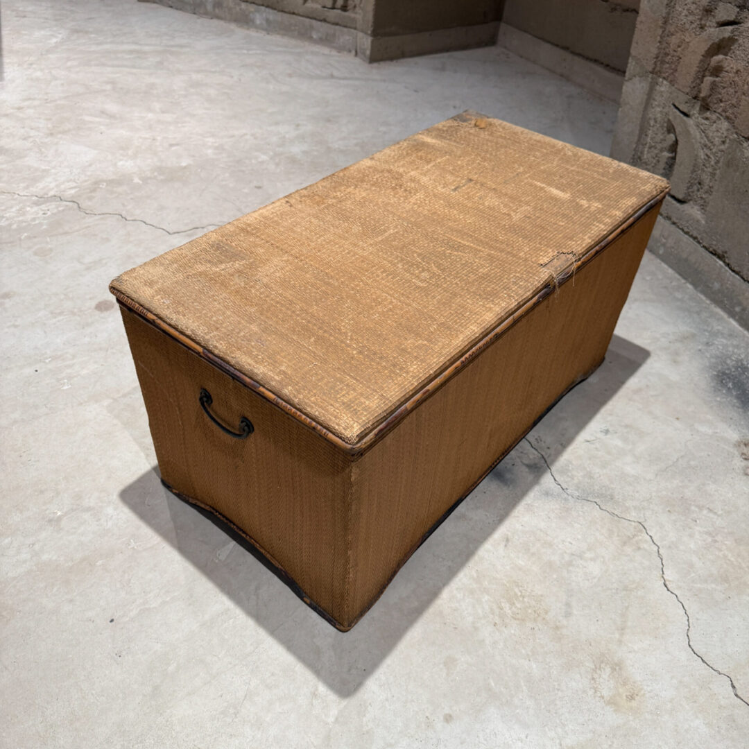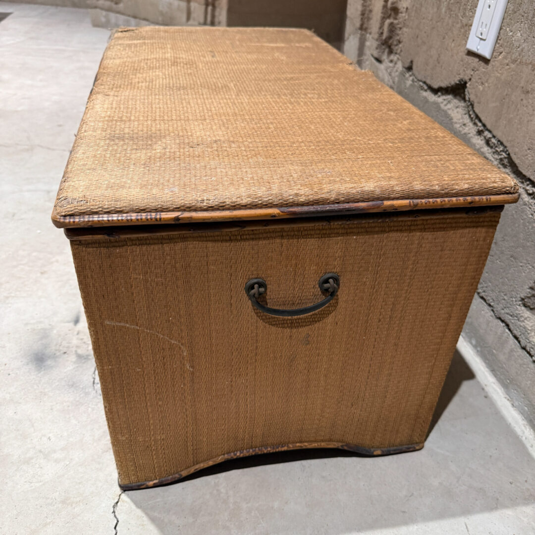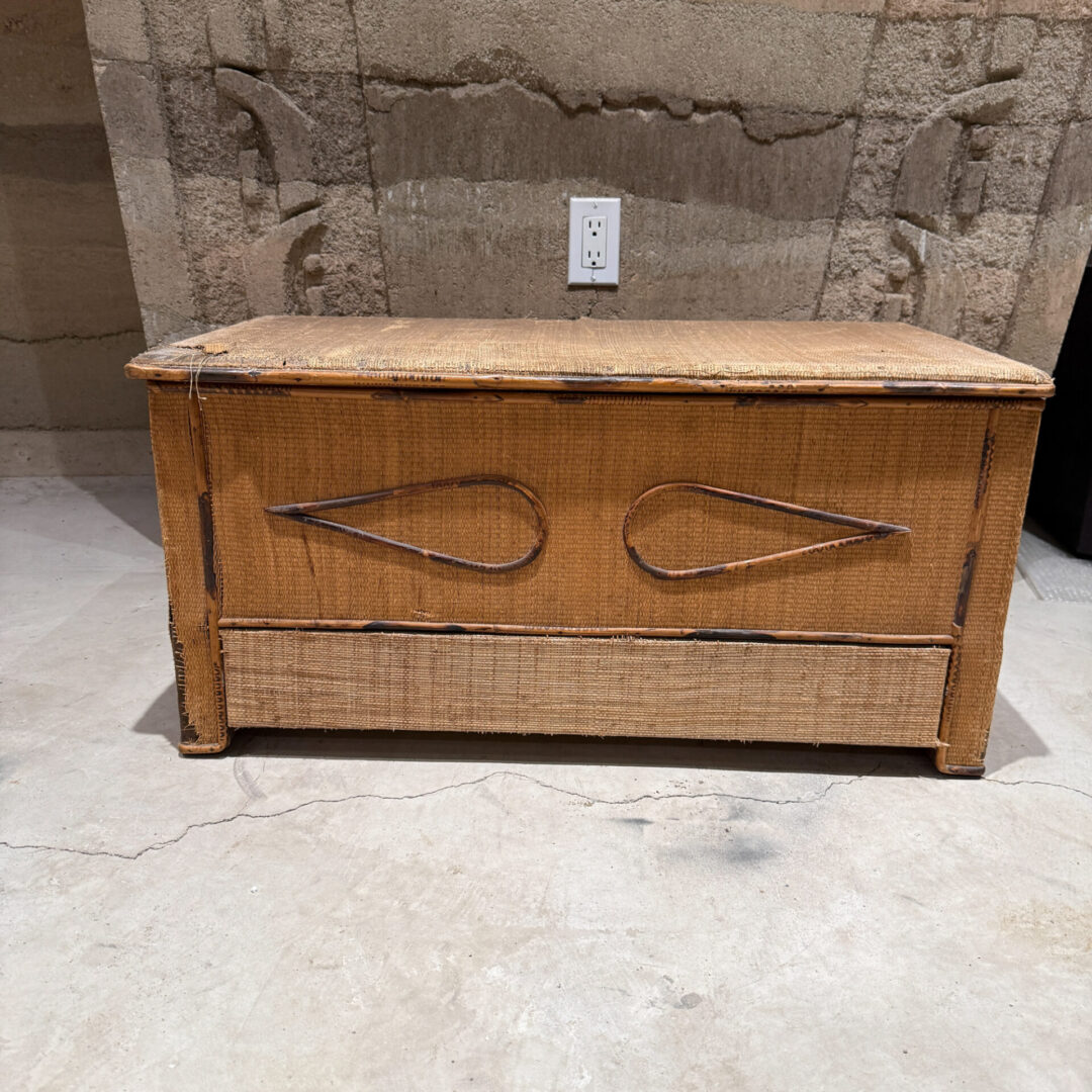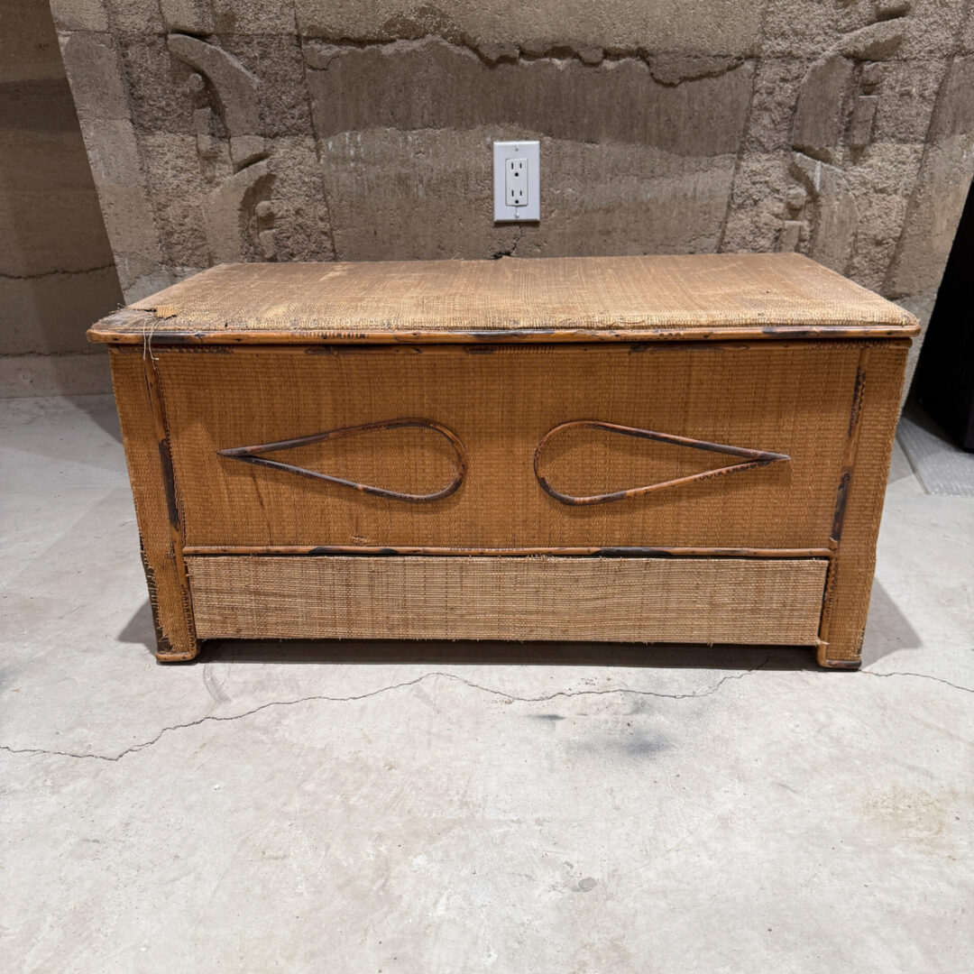 For your consideration, a vintage woven rattan or wicker storage trunk/chest, Mid-Century period.. Pieces similar to this are often described as having a bohemian, coastal, or Chinoiserie style due to the natural materials and design.