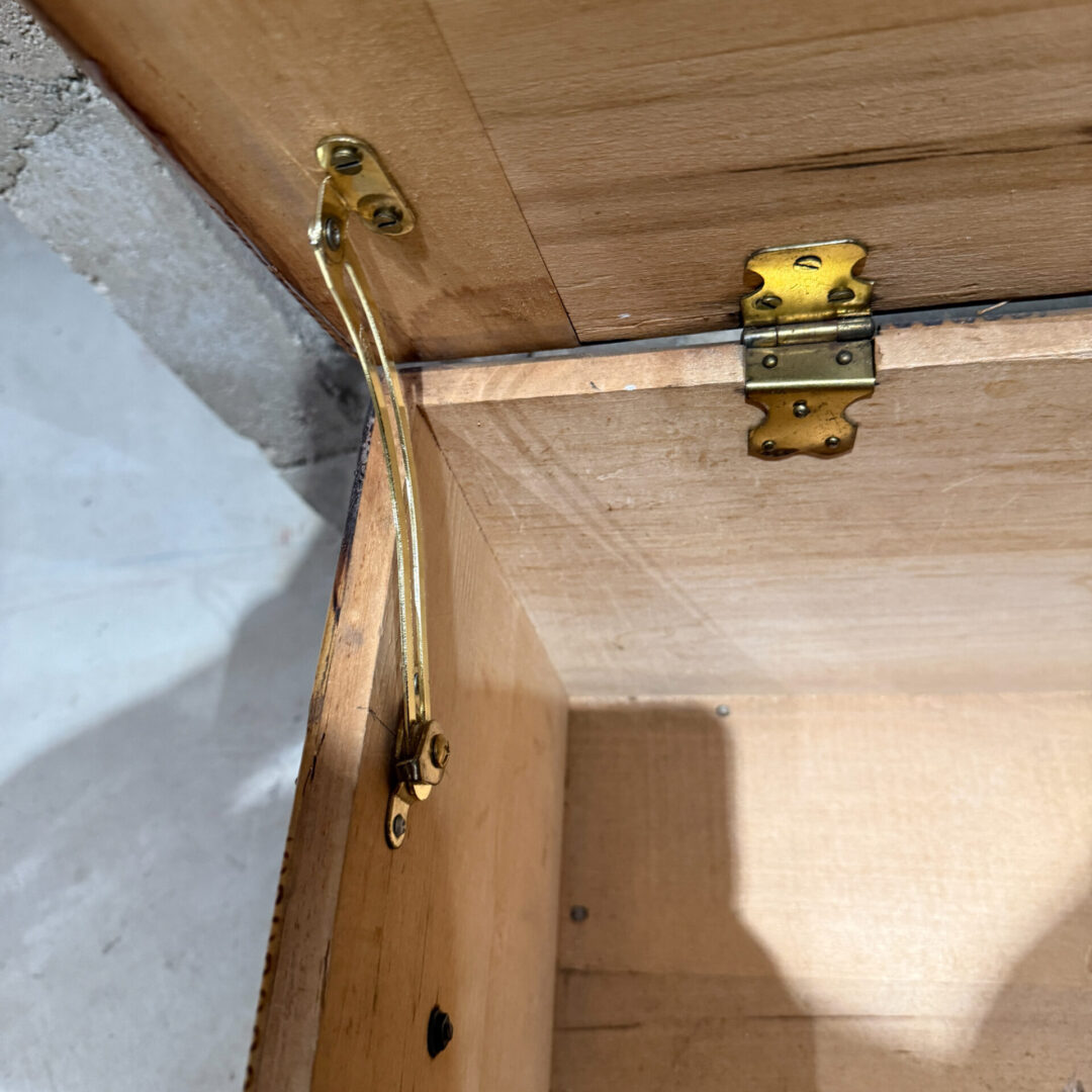 The chest has simple, dark-colored handles on the sides, made of brass (patinated) used for portability.