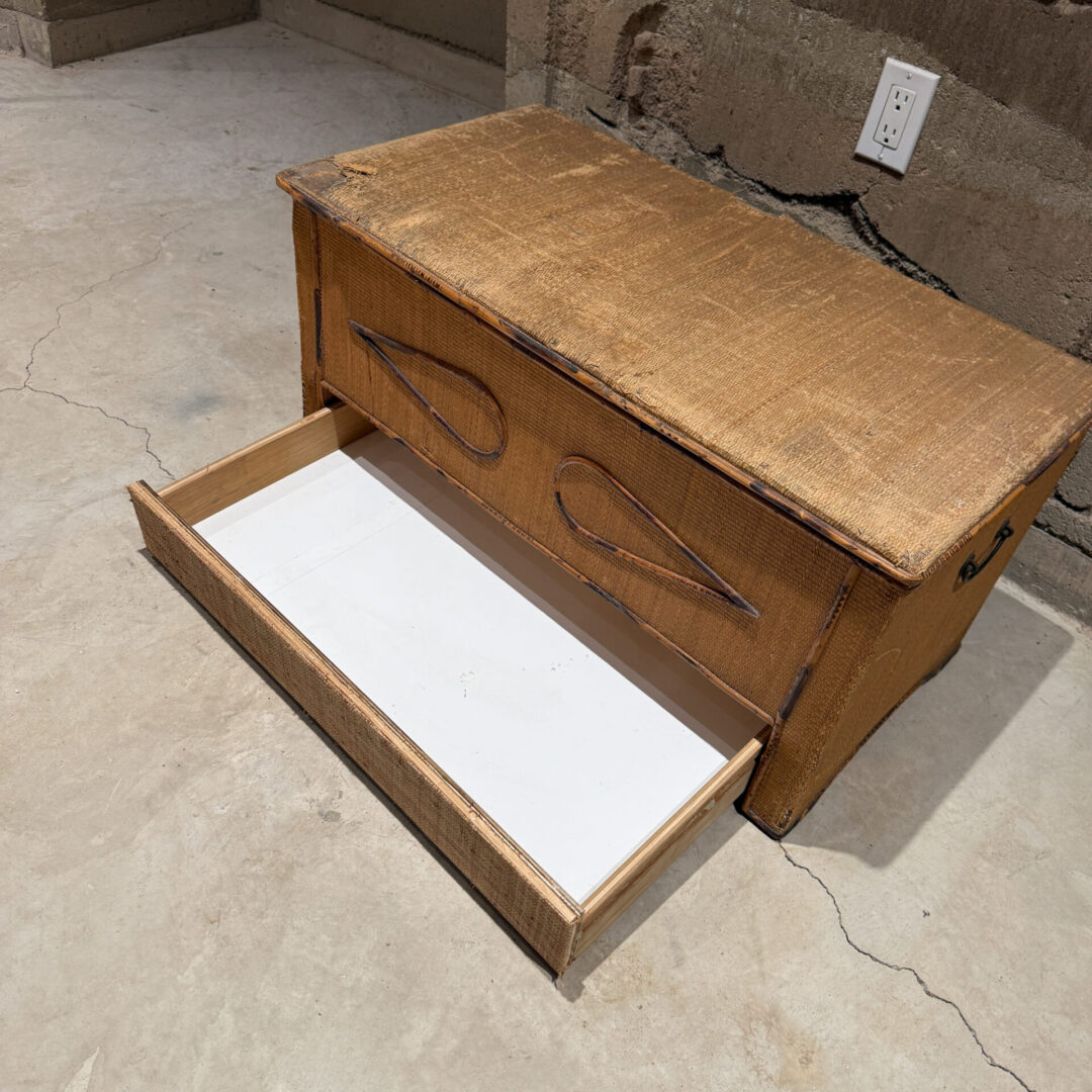 Vintage condition. Expect signs of vintage wear. Rips on original fabric. Lower drawer has been reproduced. Patina present.